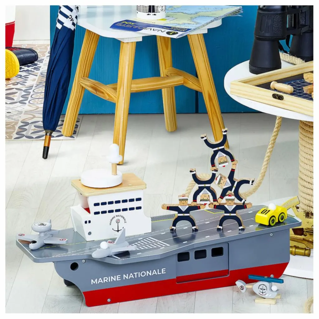 Ce porte-avions, doté d’un ascenseur, de portes coulissantes et basculantes est le jouet idéal pour les petits matelots !