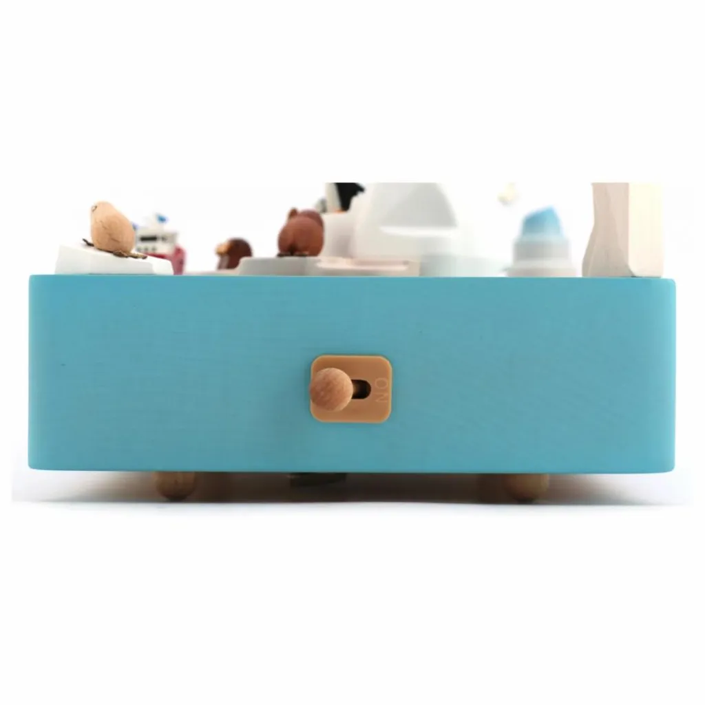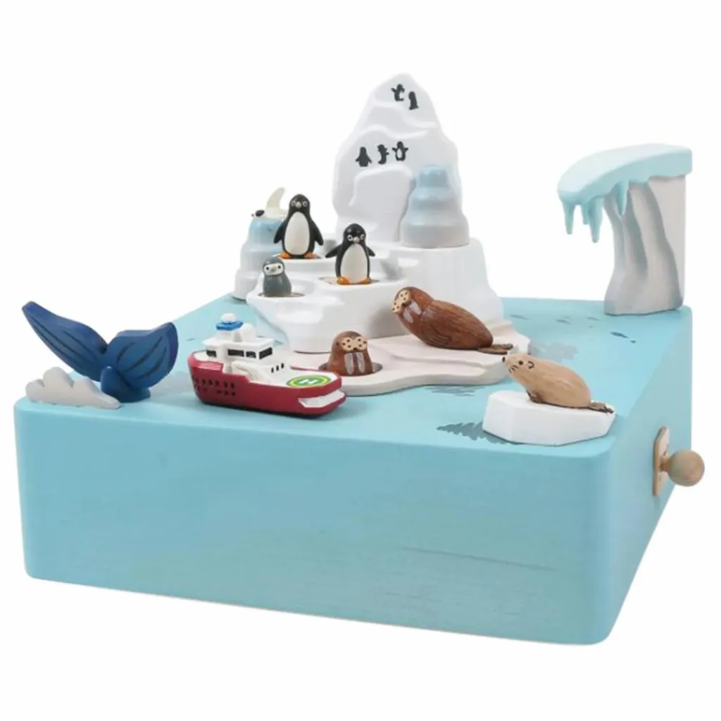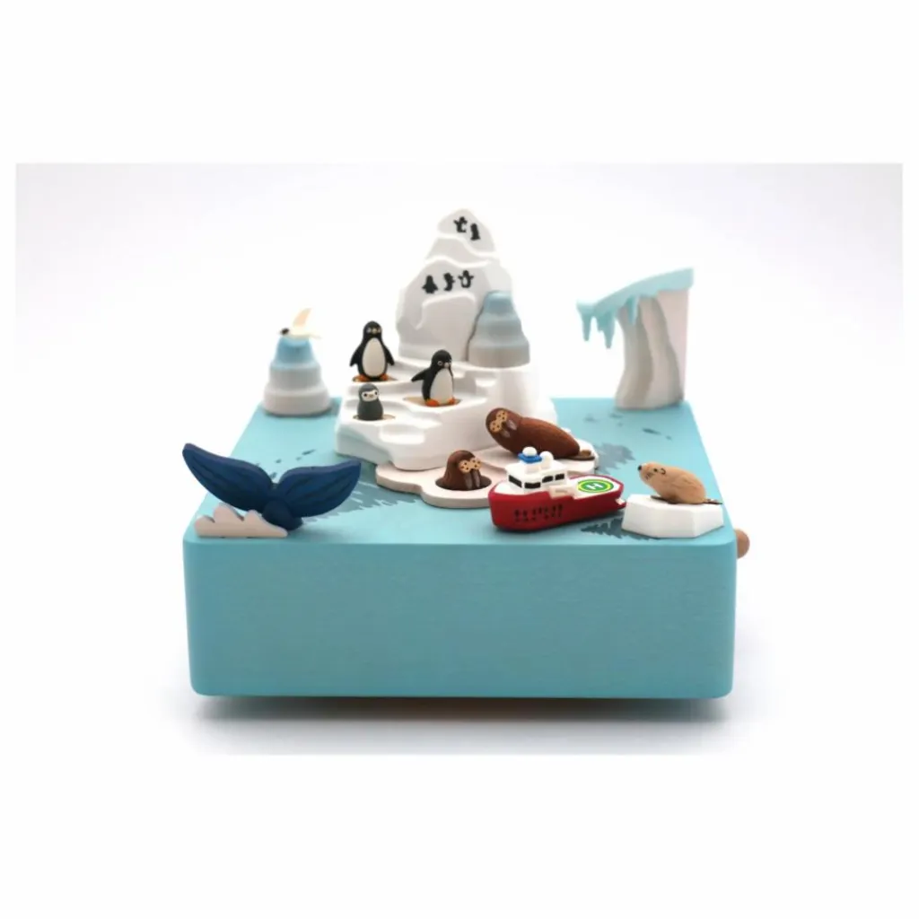 Cette boîte à musique a entièrement été réalisée en bois issu de forêts durables d’Europe, des États-Unis, du Canada et de Nouvelle Zélande. Le mouvement, créé à la main, est hérité du savoir-faire ancestral d’une manufacture japonaise. À remonter manuellement, elle joue une mélodie pendant une centaine de secondes, et livre le spectacle de son décor en mouvement. Le bateau tourne autour de la banquise.