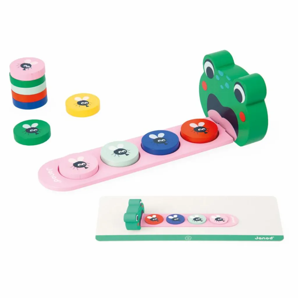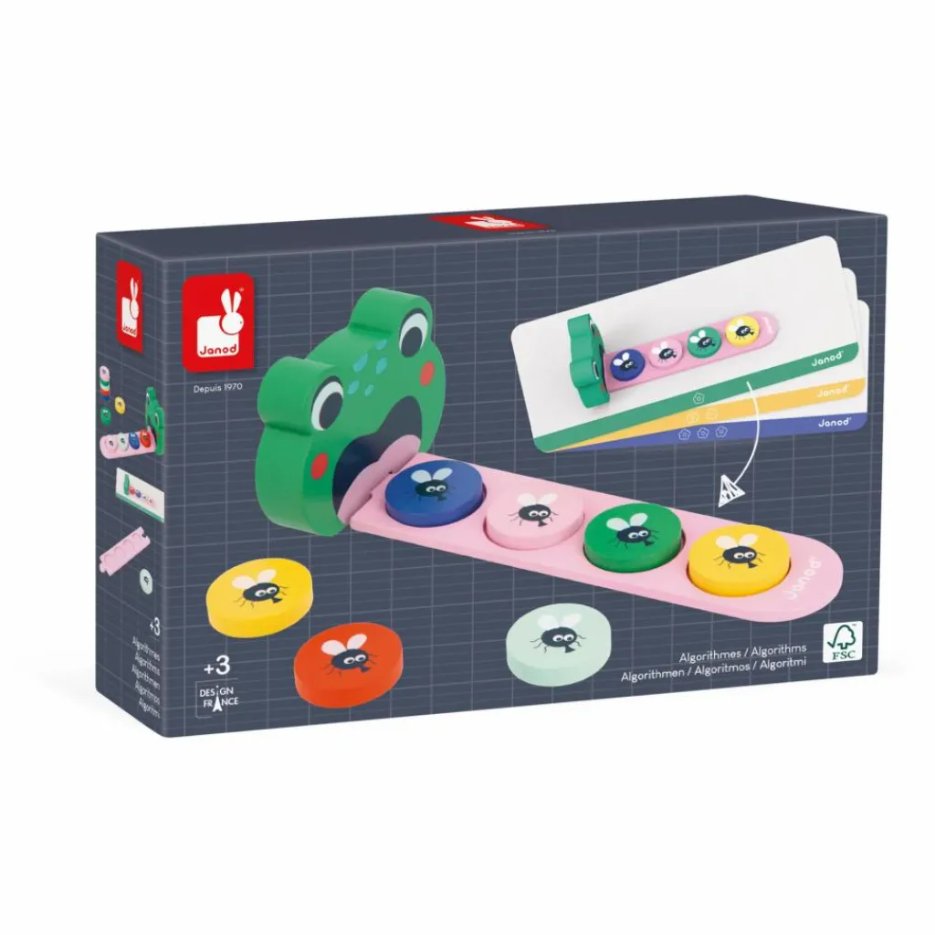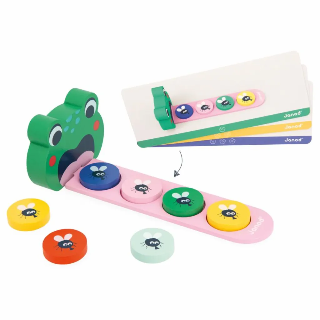 - En prenant exemple sur les 12 cartes modèle recto-verso, votre enfant devra reproduire une suite de couleurs. Une fois cette notion maitrisée, vous pourrez vous divertir à deux en accompagnant votre enfant dans l’apprentissage des algorithmes et en simplifiant cette notion grâce la grenouille en bois. Sa longue langue, faite de 3 pièces en bois qui s’imbriquent, permet de déposer bon nombre de mouches et de répéter les suites.