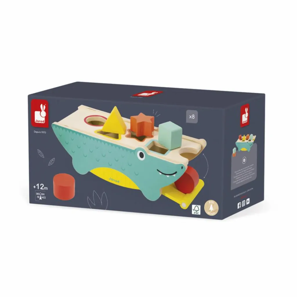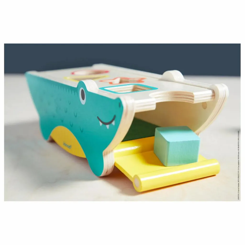 Cette boîte à formes originale représente de l’extérieur un crocodile. Chaque forme correspond à une couleur. Quand notre ami crocodile a bien mangé, on ouvre grand sa bouche pour récupérer les pièces grâce à une ouverture magnétique. Pour un repas en toute tranquillité, l’intérieur de la boîte à formes est recouvert de feutrine, ce qui atténue le bruit que font les formes quand elles tombent.