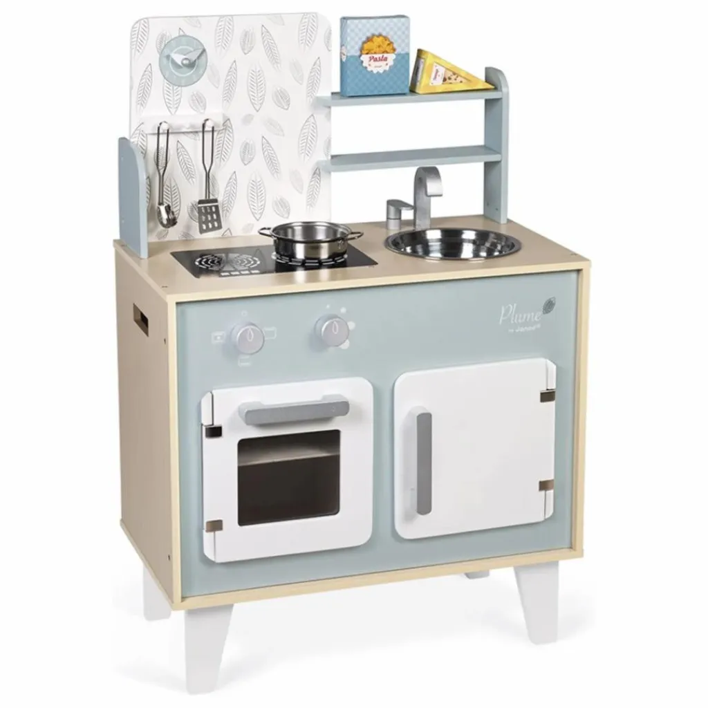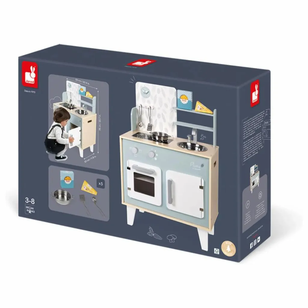 - Comme papa et maman, prépare de bons petits plats pour tes amis et deviens un vrai Petit Chef !!! Cuisine Plume toute en bois avec une patère pour suspendre la cuillère à spaghettis et la spatule en métal, accompagnées d’une casserole en métal et de 2 boites d’aliments en carton (pâtes et fromage). Comme une véritable cuisine, elle est équipée de 2 boutons rotatifs avec bruitage pour allumer les 2 plaques à induction, d’un four et d’un placard avec portes magnétiques, d’un évier en inox et d’une horloge. 5 accessoires. Hauteur du plan de travail : 50 cm. Dim : 53 x 30 x 78 cm. Pour enfants de 3 à 8 ans.