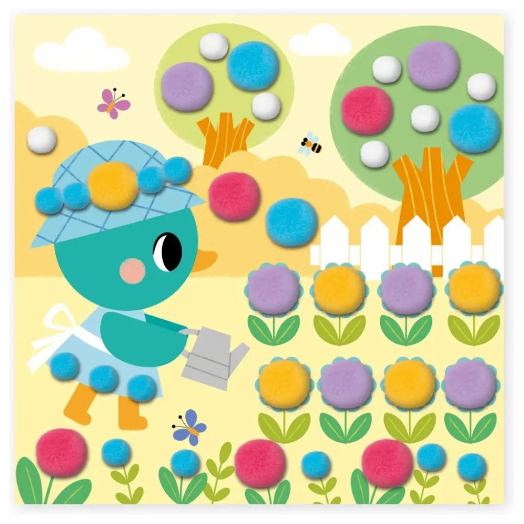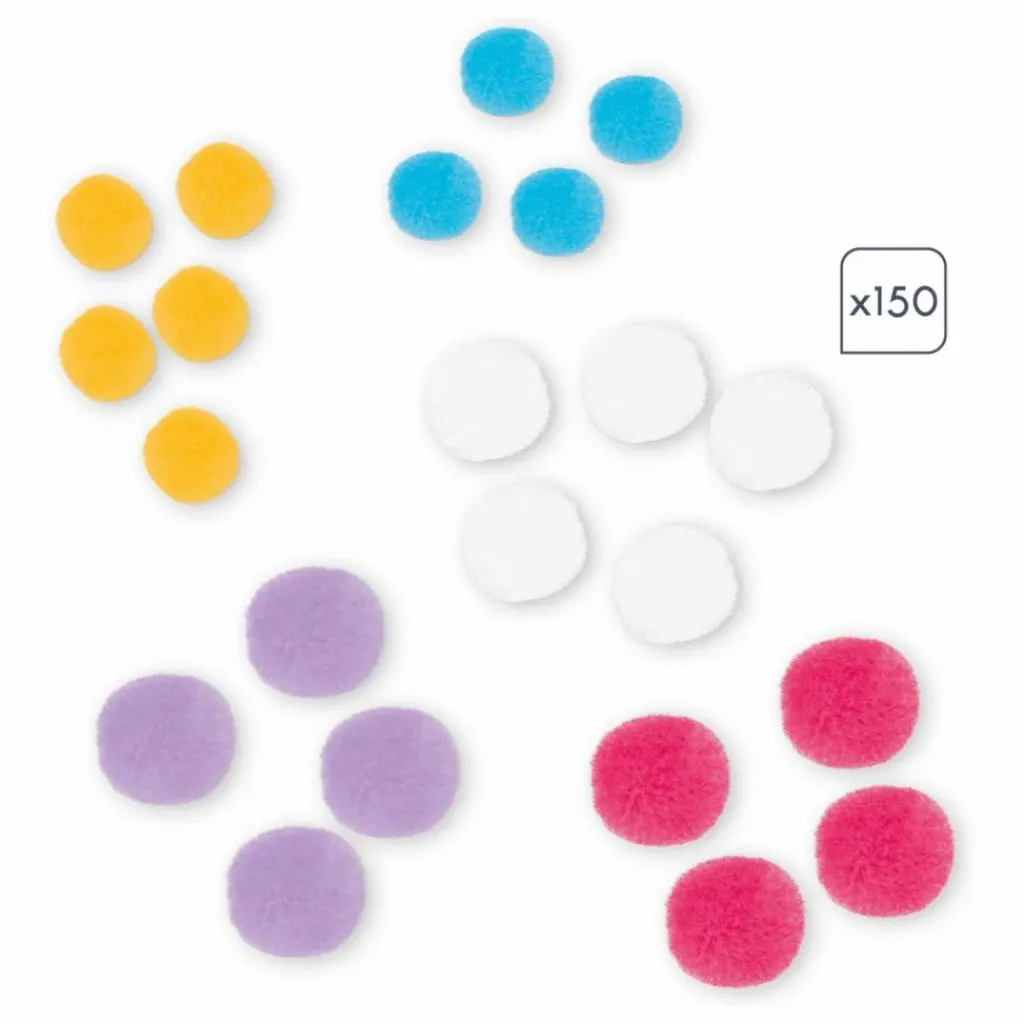 - 4 tableaux autocollants, 2 tailles de pompons de 5 couleurs différents, 4 supports de tableaux à fabriquer avec la boite, livret d’instructions
