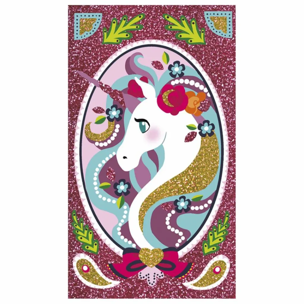 - 3 tableaux autocollants à décorer avec 2 tubes de paillettes, 1 spatule et 1 livret avec modèles avec instructions. Cette activité créative développe : la motricité, la réflexion et l’application.