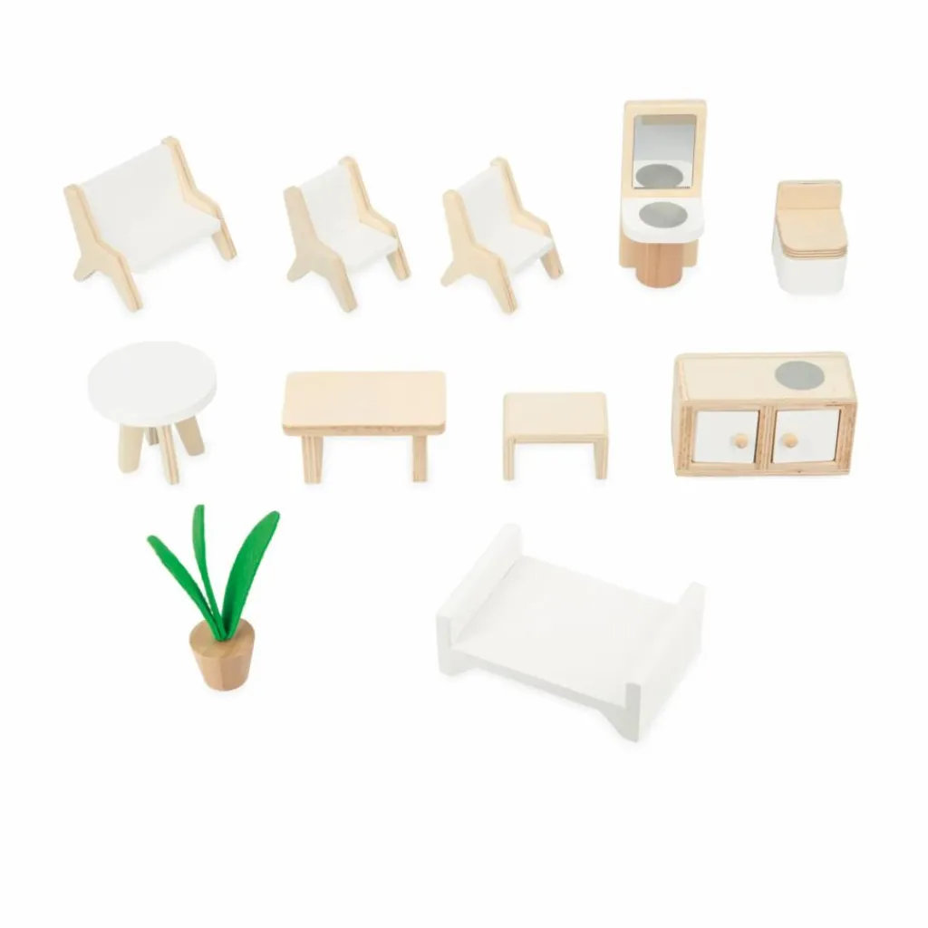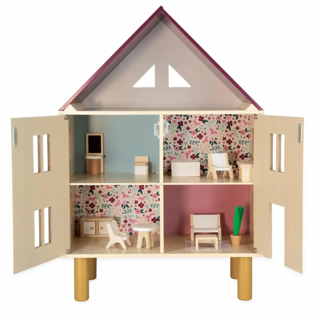 Cette maison de poupées en bois se compose de 3 étages et est meublée de 11 accessoires. Décorée avec de belles impressions au sol et aux murs, elle dispose d’ouvertures magnétiques et propose ainsi une grande surface de jeu. Les 2 portes se referment facilement pour ranger tout le contenu. Le grenier au dernier étage peut être aménagé ou décoré selon vos envies.