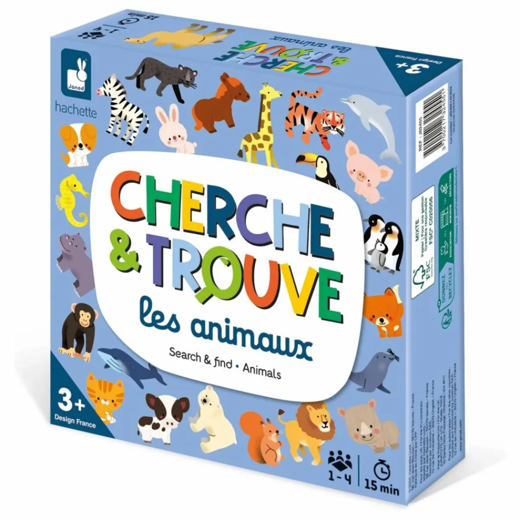 - Mon premier cherche et trouve sur la thématique des animaux ! Le but du jeu est de trouver tous ensemble des éléments sur les plateaux pour gagner 10 cartes. On choisit le côté blanc ou bleu du plateau et on joue avec le côté des cartes de la même couleur. Le plus jeune joueur lance le dé puis il pioche une carte et la montre aux autres joueurs. C’est l’élément qu’ils doivent retrouver sur le plataeau, autant de fois que le chiffre indiqué par le dé. La carte est gagnée si le nombre d’élément à trouver est atteint. Sinon, la carte est perdue. Une variante rapido est possible: il faut gagner le maximum de cartes sur une durée de 5 minutes. Il est aussi possible de jouer en solo ! La boîte contient 1 plateau de jeu recto-verso en quatre parties, 20 cartes recto-verso, 1 dé en bois et les règles du jeu en 7 langues. Une partie « classique » dure environ 15 minutes. De 1 à 4 joueurs. Dès 3 ans.