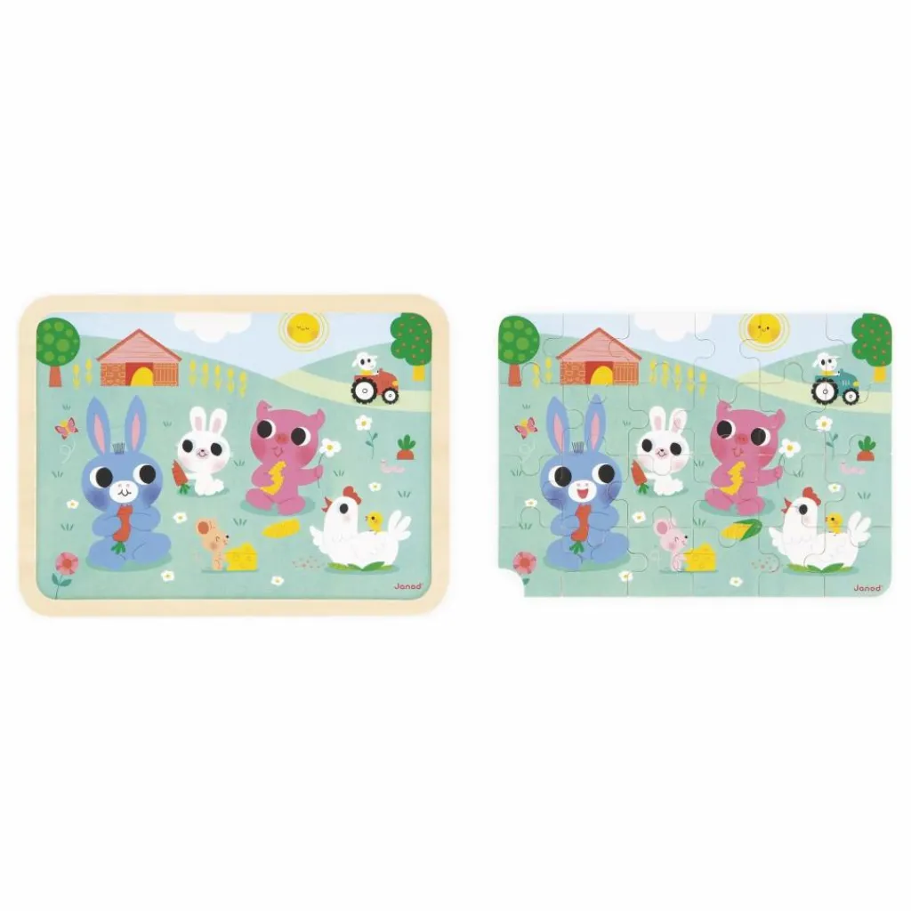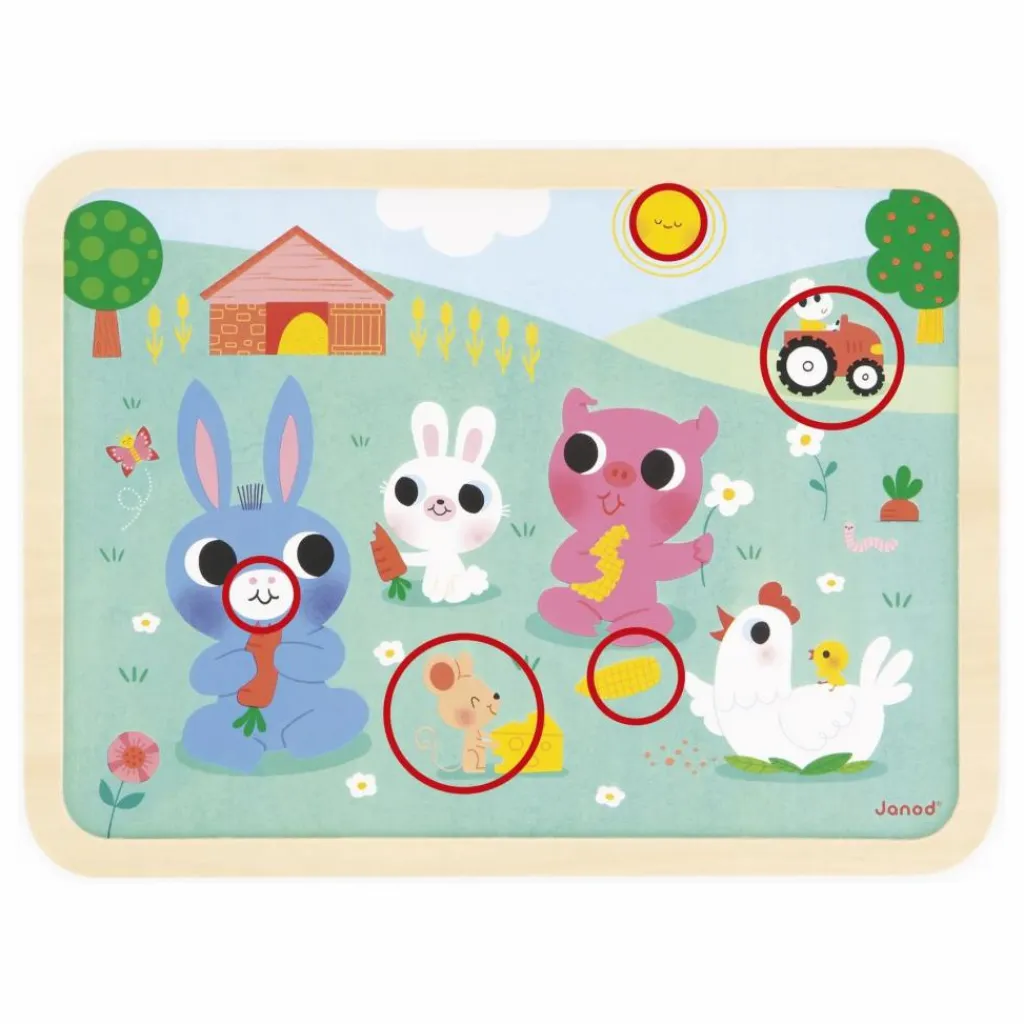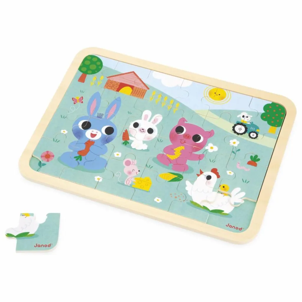 - C’est parti pour une nouvelle journée à la ferme ! Ce joli puzzle en bois composé de 24 pièces accompagnera votre enfant dans la découverte des animaux de la ferme. Pour faciliter la réalisation du puzzle, un modèle est imprimé sur le fond du plateau. D’ailleurs, 5 différences se sont glissées sur l’illustration du puzzle ! Saurez-vous les retrouver ? Le puzzle est doté d’une petite encoche facilitant le retrait des pièces. Votre enfant pourra développer sa concentration mais également son de l’observation. Jouet d’éveil en bois FSCTM pour les enfants à partir de 3 ans.