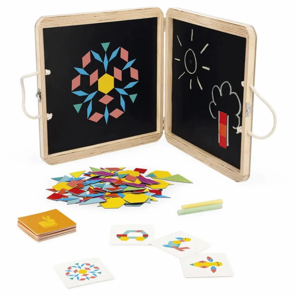 - 1 mallette de transport en bois avec 2 surfaces magnétiques, 20 cartes modèles, 120 magnets, 2 craies