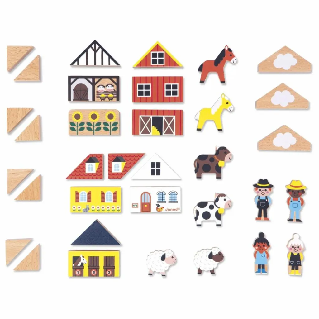 - Le fermier et la fermière ont besoin d’aide pour construire leur ferme ! Ils leurs faut une joli maison, mais aussi un abri pour les vaches et des box pour les chevaux! Avec ce joli coffret de cubes en bois massif, votre enfant pourra construire la plus belle ferme et imaginer de nombreuses histoires grâce aux animaux et personnages inclus. Ce coffret est composé de 20 cubes de construction, 4 éléments de décor et 10 personnages ou animaux. Astucieuse, la boite de rangement avec son couvercle coulissant permet de ranger toutes les pièces comme un puzzle. Il suffit de suivre le modèle au fond de la boite. Jouet idéal pour développer l’imagination. Jouet de construction, en bois certifié FSCTM, pour les enfants à partir de 2 ans. Associé à ton tapis et à la jolie panoplie de véhicules de la gamme Janod, ce coffret de cube complète parfaitement ton univers.
