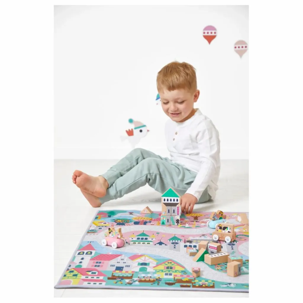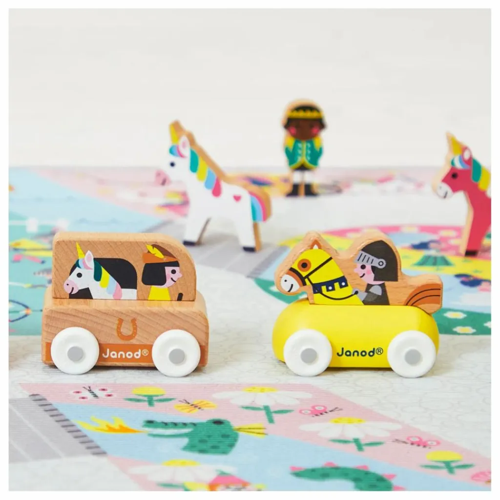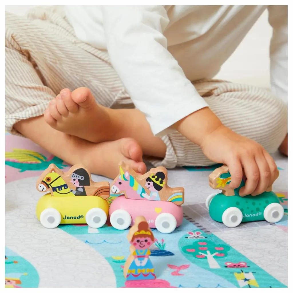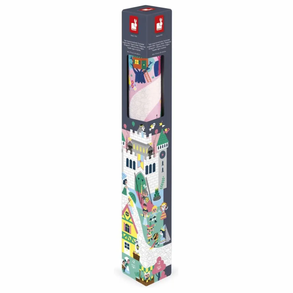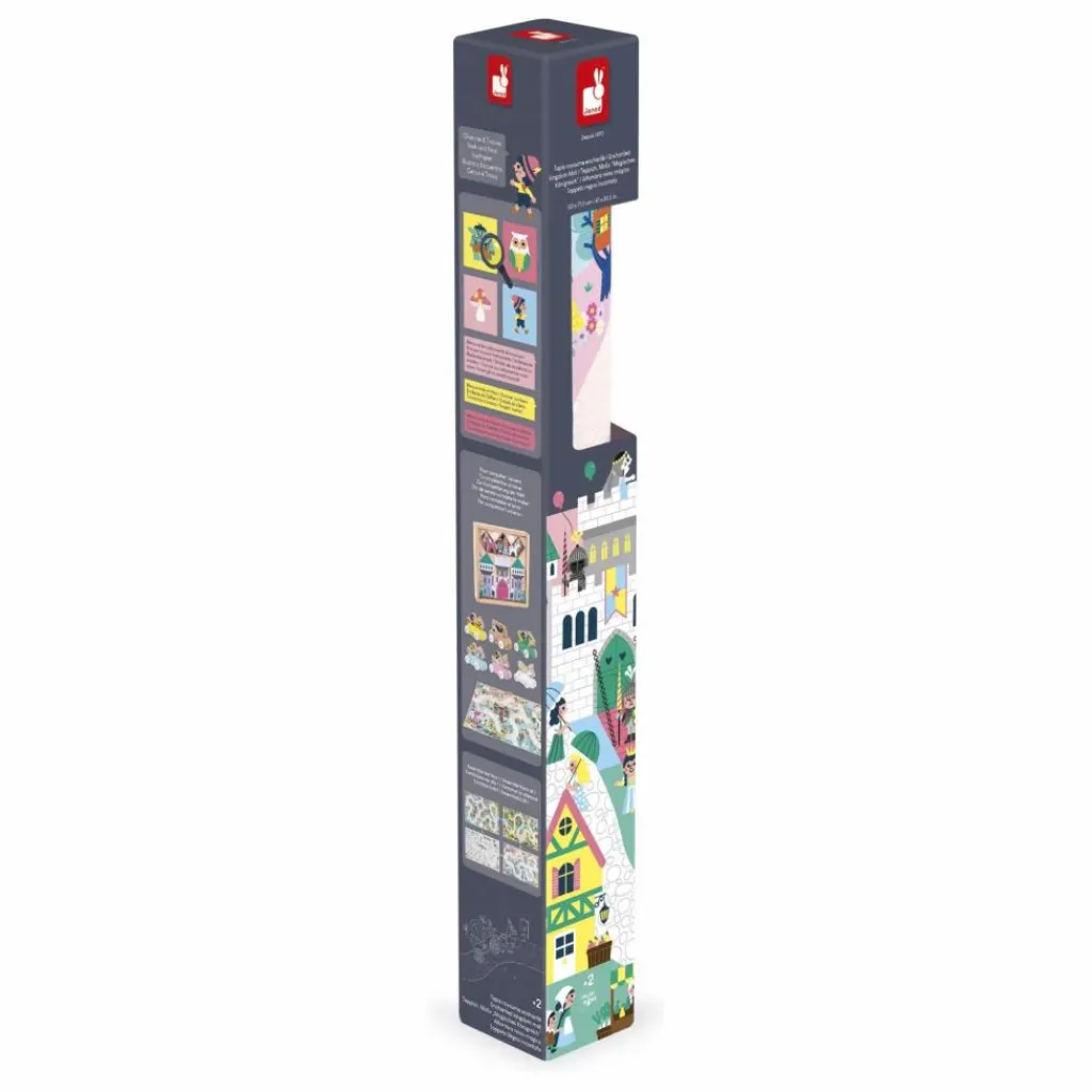- Des licornes galopent dans la plaine rose, un sorcier prépare une potion dans la forêt, un château fort est sur le point de se faire attaquer par un dragon, pas de doute nous sommes bien au royaume enchanté ! Pour découvrir tous les recoins de ce fabuleux royaume et imaginer de nombreuses histoires il faudra parcourir le long chemin pavé. Ce tapis est idéal pour stimuler l’imagination. C’est également un cherche et trouve géant. Saurais-tu retrouver le trompettiste du roi ? Il permet aussi à l’enfant de développer son vocabulaire autour des instruments de musique, des chiffres et des émotions. Le petit plus : le tapis est anti-dérapant ! Votre enfant pourra facilement faire rouler ses petits véhicules et jouera en toute sécurité. Jouet d’imitation pour les enfants à partir de 2 ans. Ton tapis peut être complété d’une jolie panoplie de véhicules et de cubes en bois à retrouver dans la gamme Janod. Tu peux aussi l’associer aux autres tapis de la gamme pour créer un espace de jeu géant !