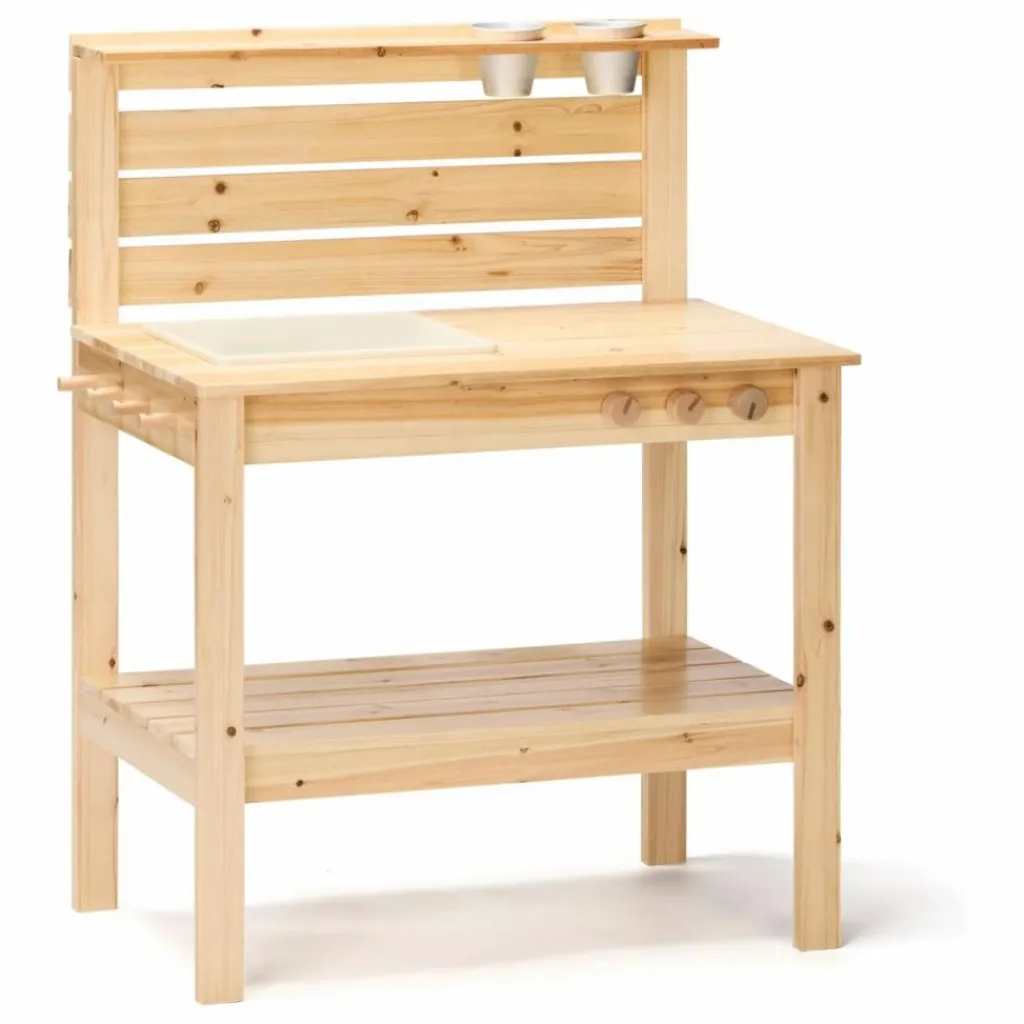 - Cette cuisine d’extérieur ou table à patouille KID’S HUB est un jeu extrêmement polyvalent qui offre une grande variété d’utilisations et de fonctions. Elle comprend un évier en plastique qui peut être utilisé pour l’eau ou le sable, ce qui permet aux enfants de découvrir le jeu sensoriel et d’explorer différentes textures. Le bac d’eau accroché, muni d’un robinet, offre une réserve d’eau toujours pratique pour leurs activités. La table à patouille peut se transformer en cuisine, ouvrant toutes les possibilités de jeu d’imagination, comme devenir un grand chef ou ouvrir son café ou restaurant d’extérieur. La tablette du haut permet de recevoir divers articles et objets, stimulant le sens de l’organisation et les scénarios de jeu d’imitation. L’étagère du bas est prévue pour les casseroles, poêles et ustensiles de jardinage, invitant les enfants à s’amuser à jardiner et à s’exercer aux activités de cuisine. Elle permet un accès aisé à leurs outils et stimule leur sens du rangement et des responsabilités. Cette table à patouille est également munie de quatre crochets sur le côté, très pratiques pour accrocher les outils de jardinage ou des serviettes. Les outils restent ainsi à portée de main et facilement accessibles pendant le temps de jeu. La tablette du haut sert d’espace de rangement ou de desserte, tandis que les deux pots en zinc se placent dans les trous pour offrir un rangement supplémentaire ou servir de présentoirs pour les clients ou accueillir des plantes, en fonction du jeu choisi par les enfants. L’étagère du bas offre également un plus grand espace pour recevoir les outils plus encombrants ou autres ustensiles de jardinage, garantissant une place à chaque chose et développant les compétences d’organisation. Cette table à patouille est conçue dans une perspective de durabilité, c’est-à-dire qu’elle sera capable de supporter longtemps le poids des équipements et outils, pour des heures et des heures de jeu. D’une manière générale, cette table à patouille est conçue pour encourager le jeu d’imagination, l’organisation et les scénarios de jeu d’imitation. Elle offre aux enfants un espace polyvalent pour s’immerger dans diverses activités, comme le jeu sensoriel, le jardinage, la cuisine ou s’amuser à tenir leur propre établissement.