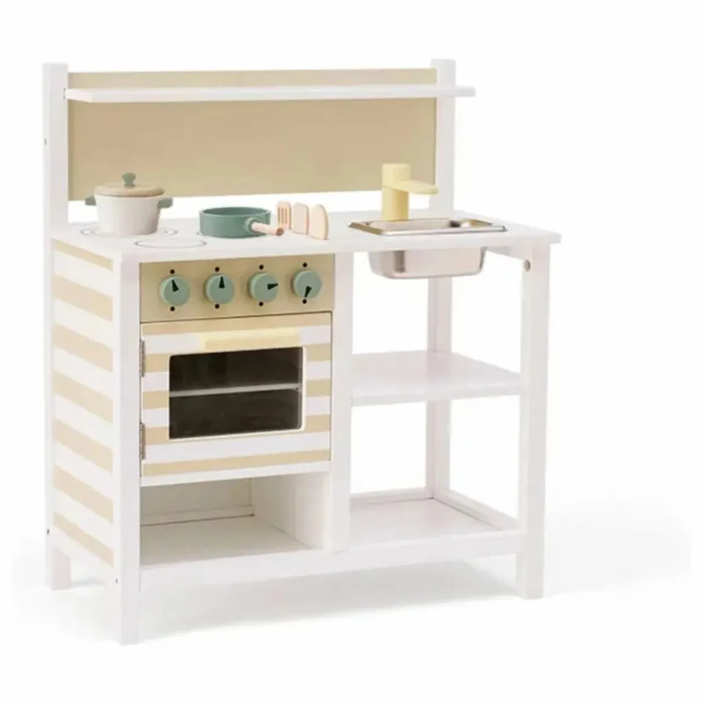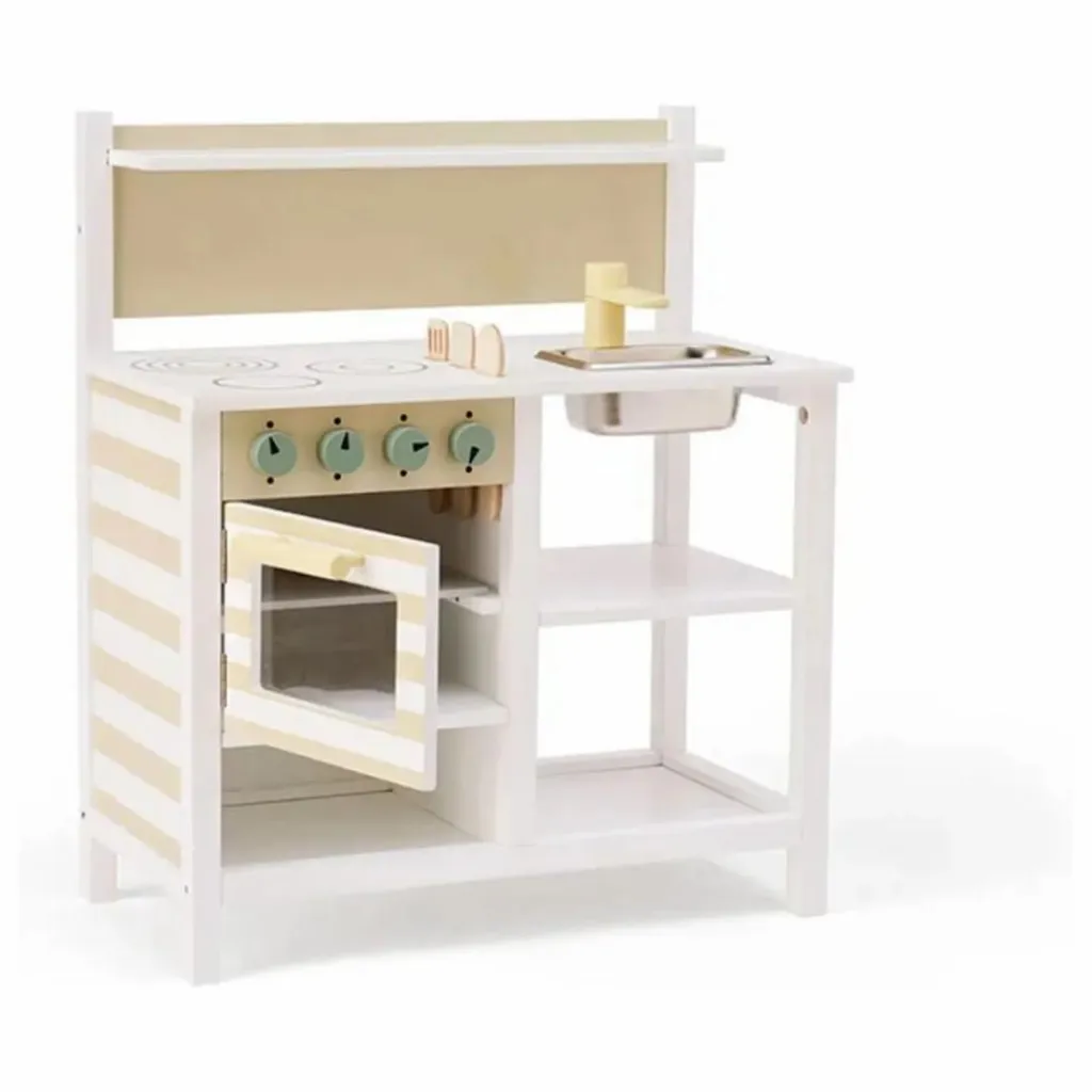 Trois ustensiles de cuisine en bois – une cuillère, une cuillère à rainures et une spatule – sont inclus et peuvent être rangés dans des emplacements prévus à cet effet sur le plan de travail. Une petite étagère sur le dosseret permet de ranger les petits objets, tandis qu’une étagère ouverte en dessous offre un espace de rangement supplémentaire pour les casseroles, les poêles ou les jouets. Le motif rayé sur la façade du four et sur le côté de la cuisine ajoute un détail simple et ludique.
