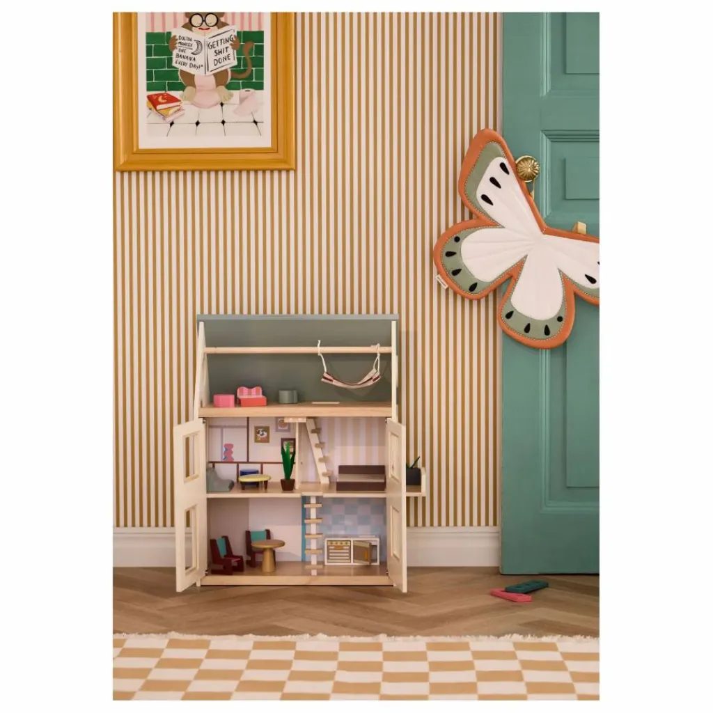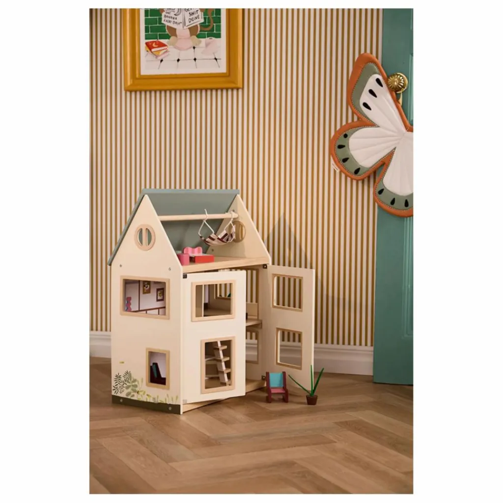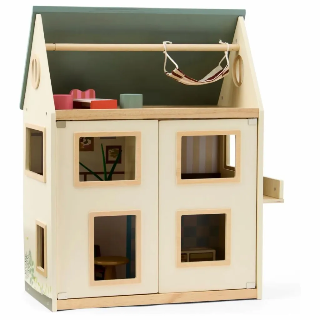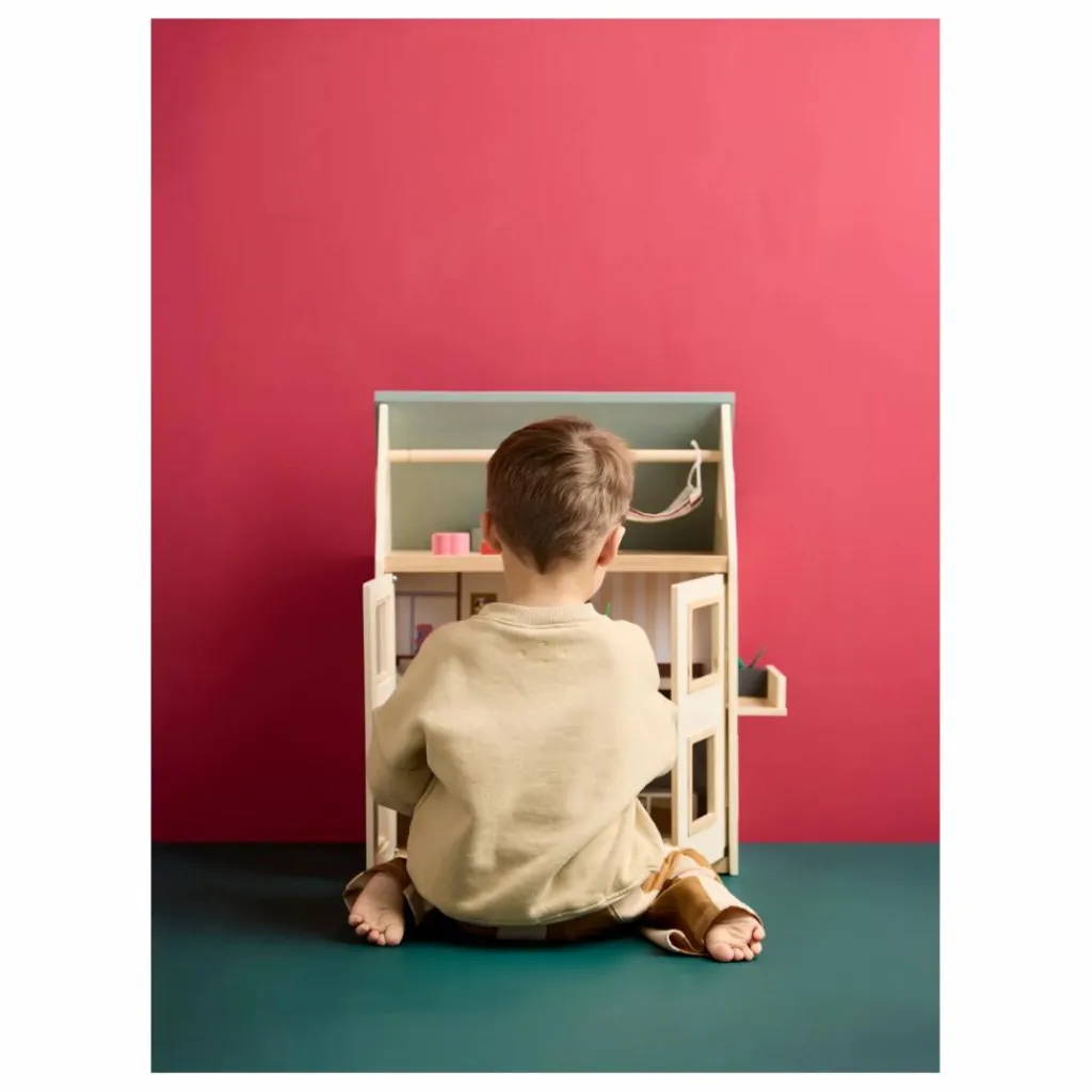 La maison de poupée comporte trois niveaux, des portes d’entrée, de grandes fenêtres et un toit qui s’ouvre pour faciliter l’accès pendant le jeu. Le mur du fond est pourvu d’un « papier peint » imprimé et d’éléments décoratifs, mais il peut également être inversé pour révéler des murs blancs simples, ce qui permet une décoration personnalisée. Le balcon comprend une petite plante en pot.