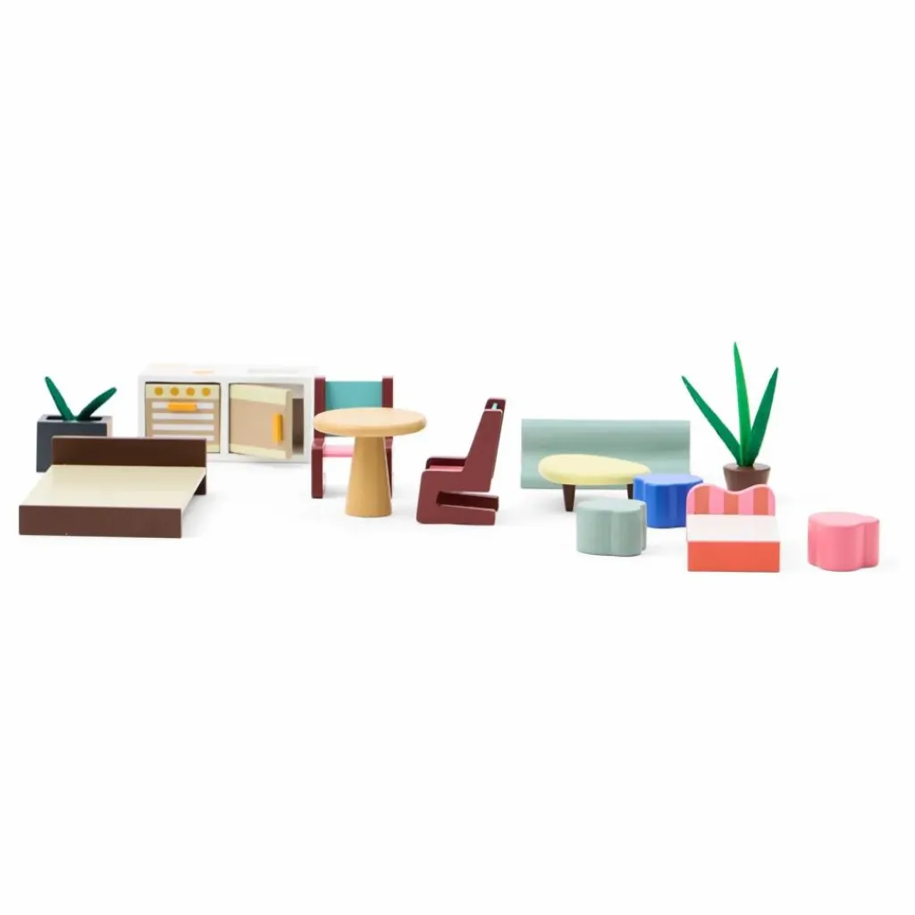 La maison de poupée est entièrement meublée d’un canapé, d’une table basse, de deux chaises de salle à manger, d’une table à manger, d’un meuble de cuisine, d’un lit double, d’un lit simple pour enfant, d’un hamac et de trois tabourets qui peuvent également être utilisés comme tables d’appoint. Conçue à l’échelle 1:12, la norme pour les maisons de poupées, elle offre la possibilité d’ajouter d’autres meubles et accessoires, ce qui facilite la création d’un espace joliment décoré.