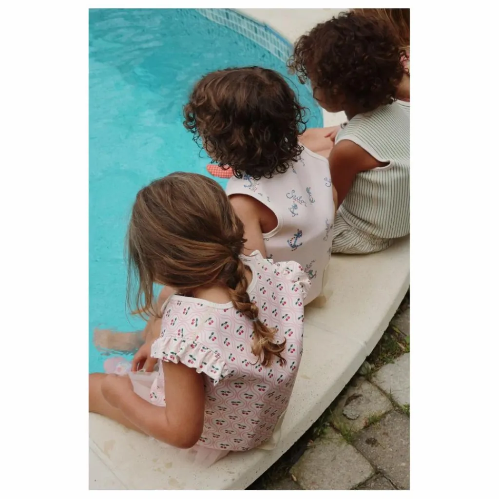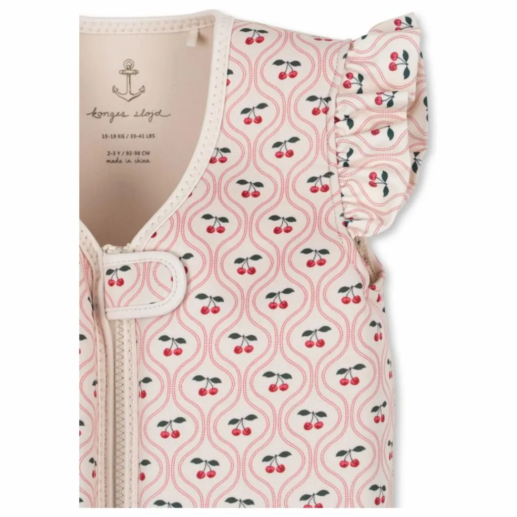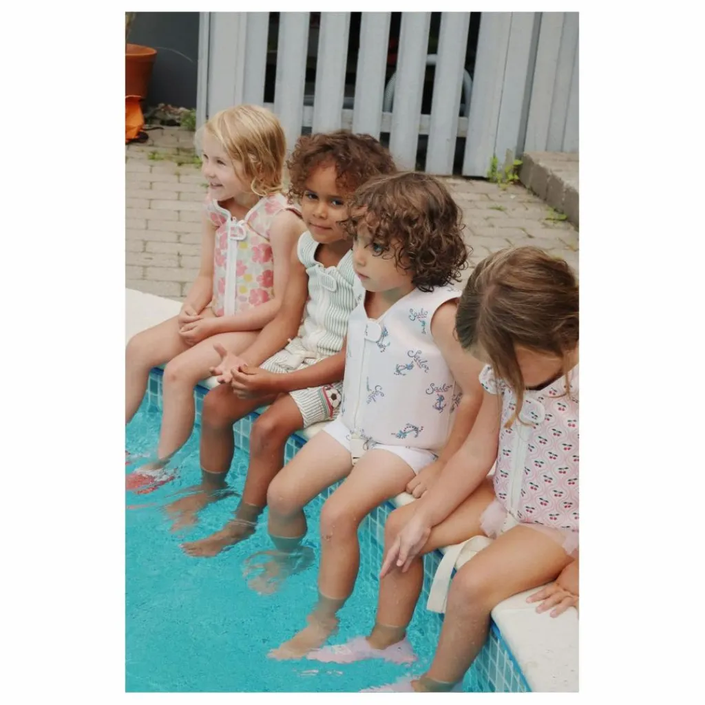- Maillot de bain à effet chatoyant avec des détails à volants sur les épaules. Il est doté d’une fermeture à glissière et d’une fermeture velcro, ainsi que d’une sangle d’entrejambe de sécurité à boucle.