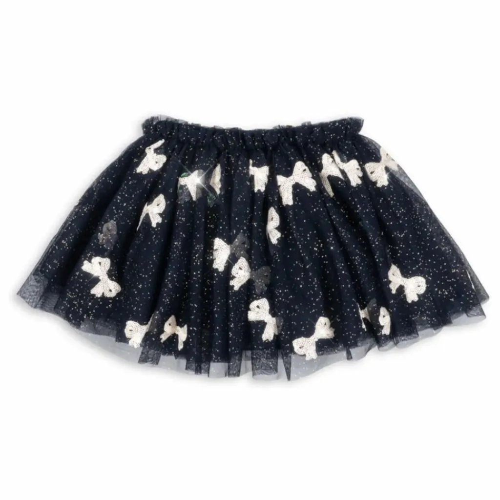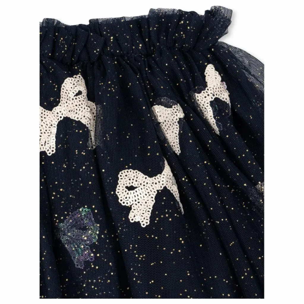 - Jupe volumineuse en tulle, doublée de coton doux et dotée d’une taille élastique. Ornée de paillettes.