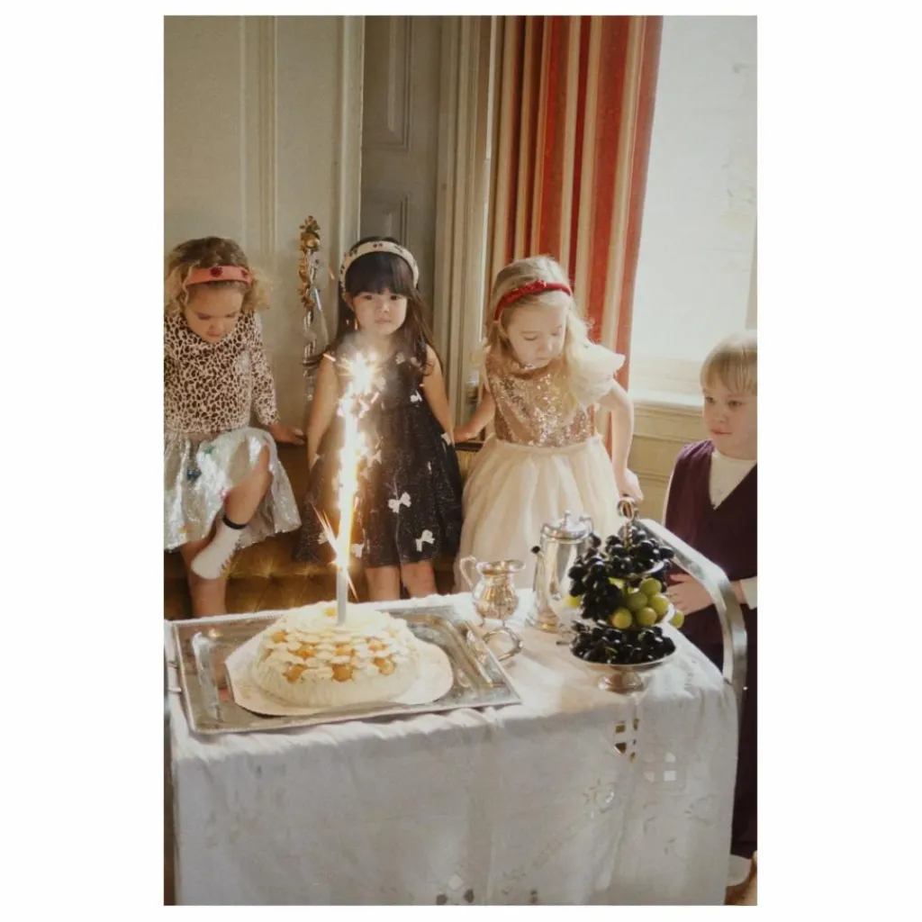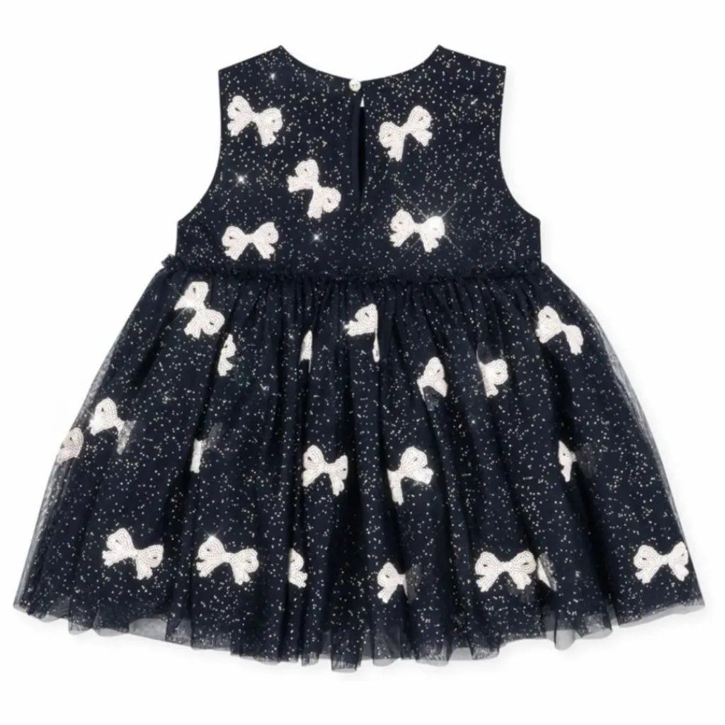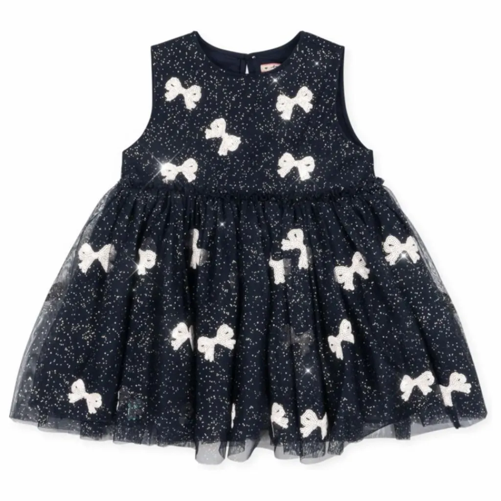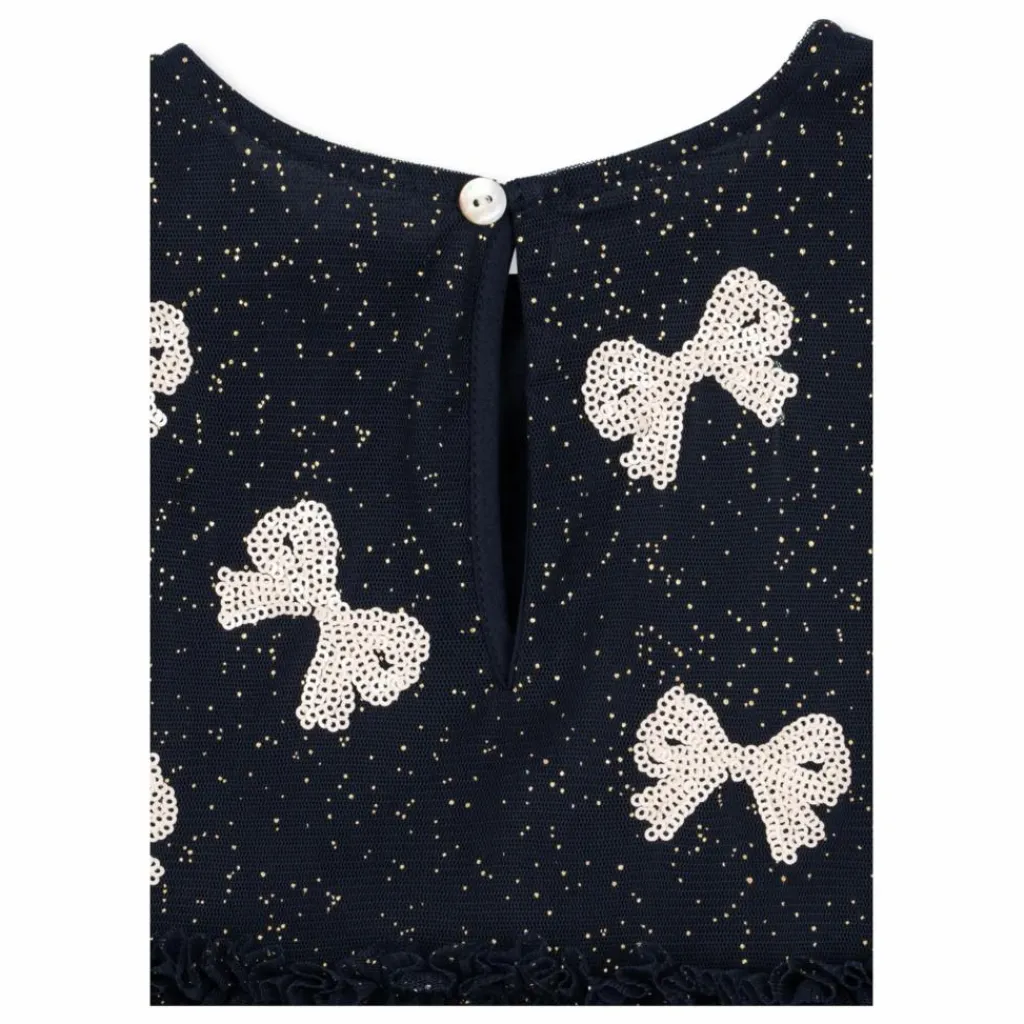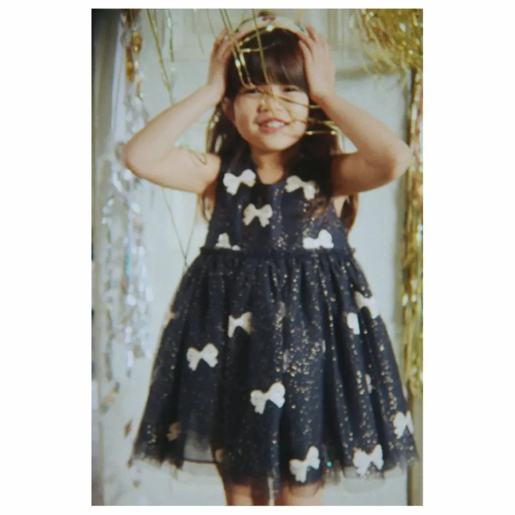 - Robe en tulle ornée de nœuds à sequins et d’un effet scintillant sur l’ensemble.