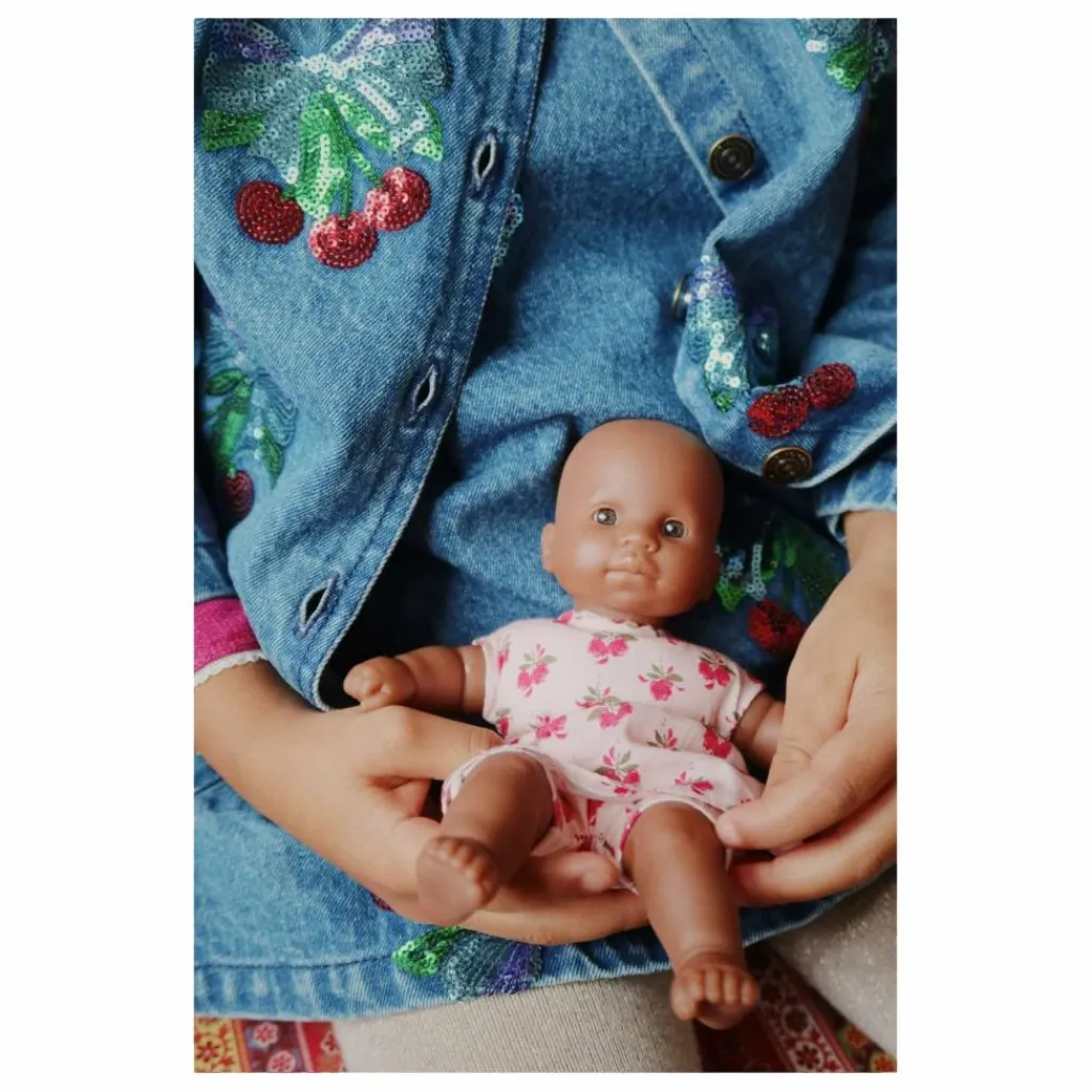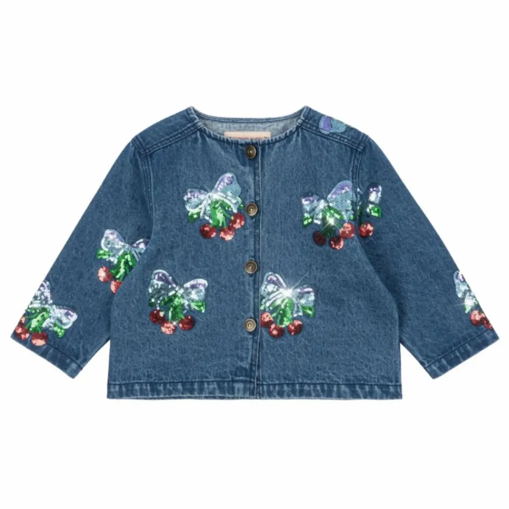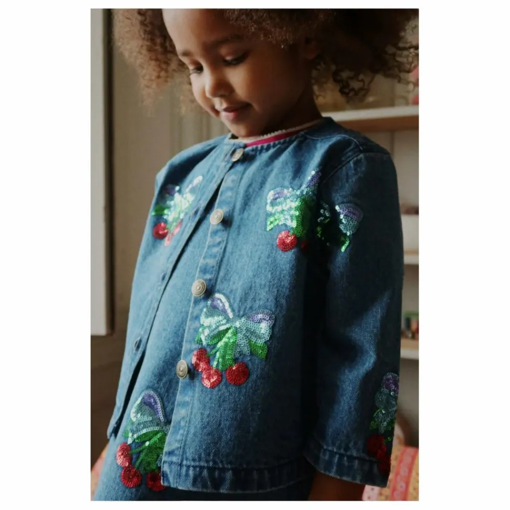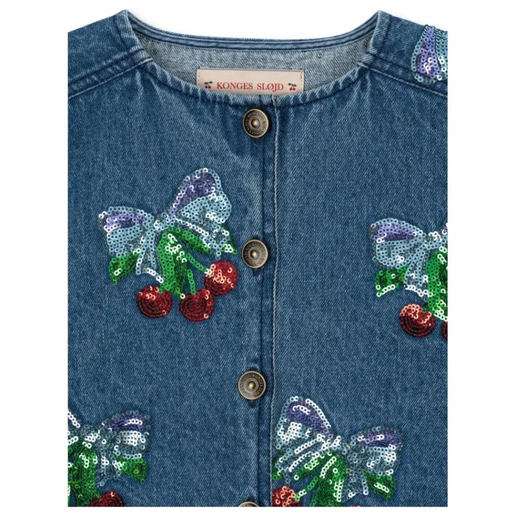- Chemise en denim souple avec col rond et nœuds de cerises brodés en paillettes.