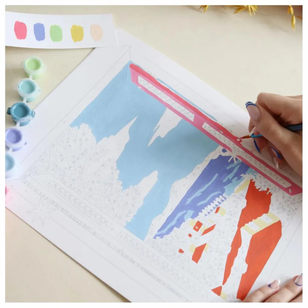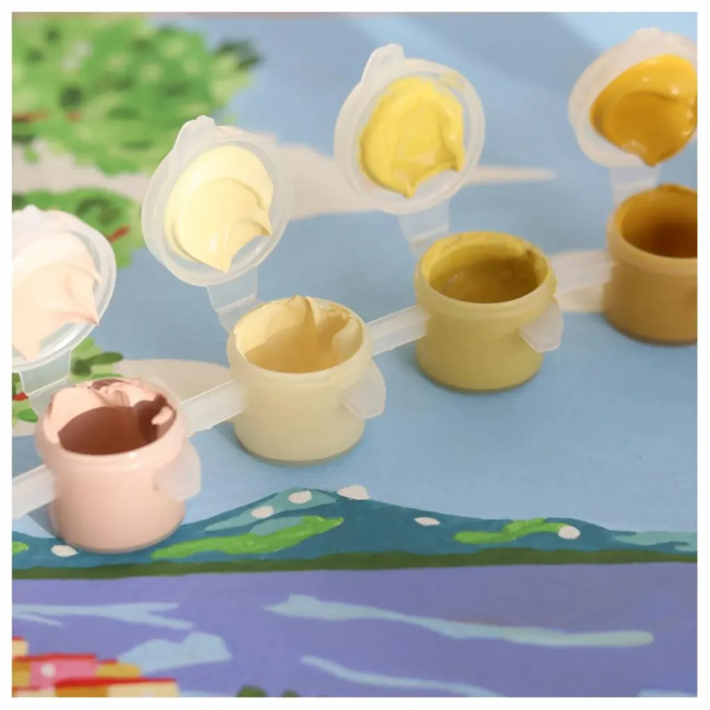 - Contient : Une illustration à peindre, 2 pinceaux, 18 petits pots pré-remplis de peinture, 1 planche de stickers numérotés, 1 notice