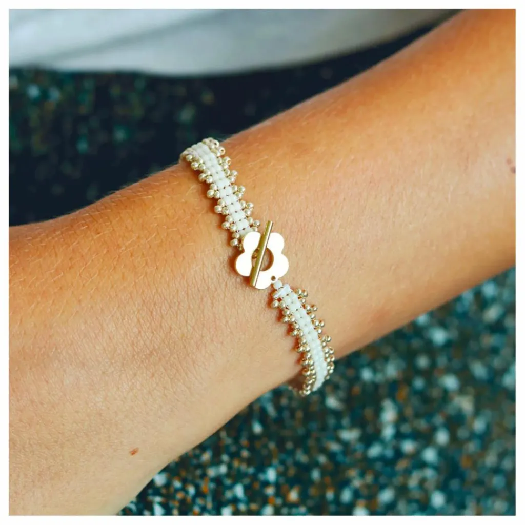 - 2 crochets d’oreille, 2 anneaux créoles, 1 fermoir mousqueton doré à l’or fin, anneau, 1 aiguille à enfilage simplifié, fil pour tissage de perles Miyuki, fil en laiton doré, 10 perles naturelles 4 mm, Lot de perles de rocailles 11/0, 1 livret explicatif