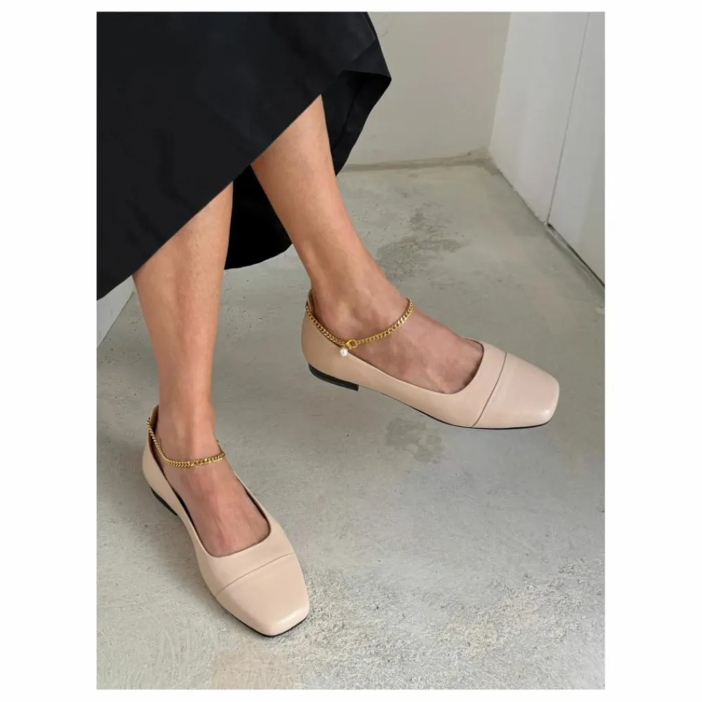 - – dessus : cuir souple nude – bout carré – chaîne de cheville dorée (réglable et amovible) avec perle – intérieur : doublure souple en cuir camel avec semelle intérieure en mousse pour plus de confort semelle : semelle antidérapante – cuir avec caoutchouc à l’avant talon : 1,5cm sac à poussière et boîte