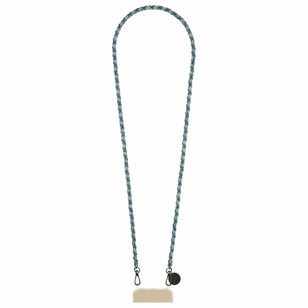 - Chaîne Cali de 120 cm en métal et jean clair, mousquetons en métal et médaille gravée « LCF ».