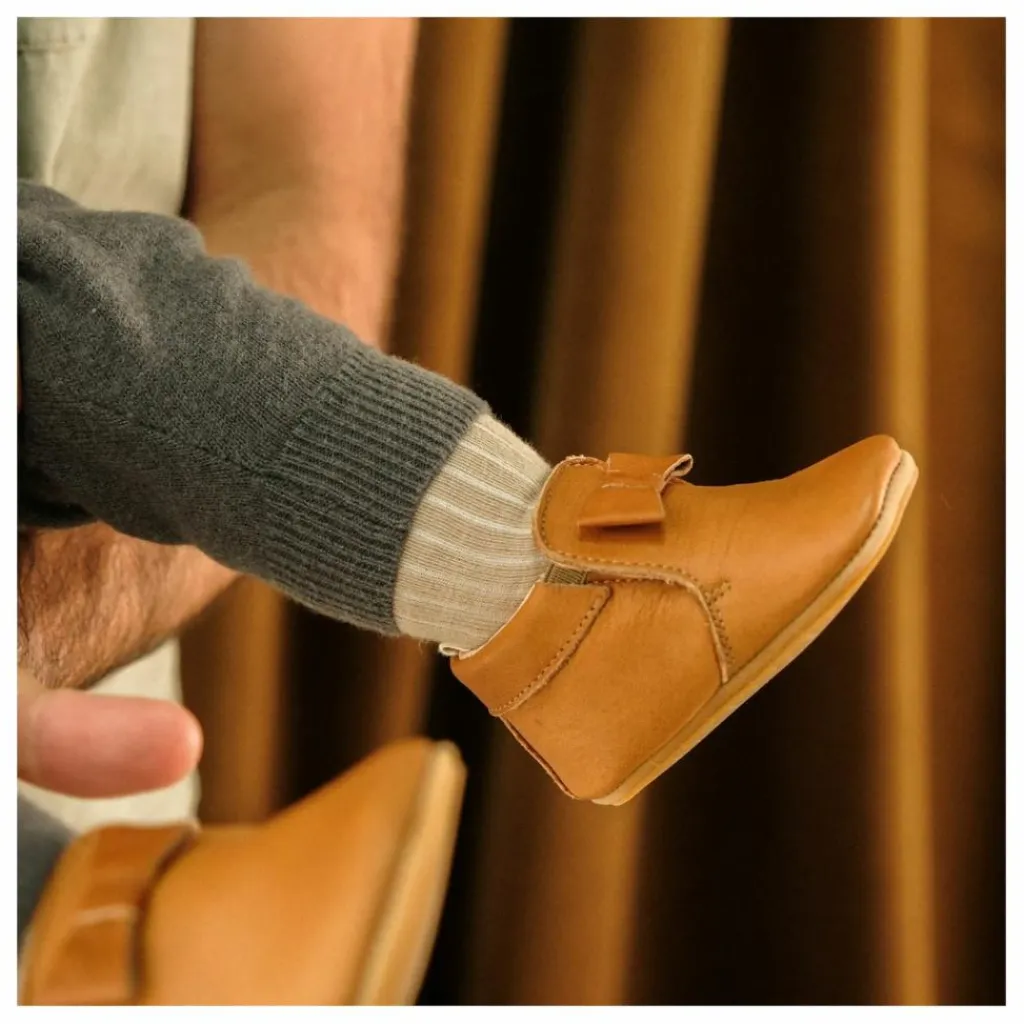 - Les chaussures premiers pas Axelle sont conçues pour accompagner les enfants ayant acquis la marche autonome. Inspirées de la Chelsea boot, elles combinent élégance et praticité avec un élastique latéral et une fermeture zippée intérieure, facilitant l’enfilage et favorisant l’autonomie. Fabriquées en cuir sans chrome et sans métal, elles offrent souplesse et confort grâce à une semelle en caoutchouc sans voûte plantaire et une construction cousue Strobel, respectant le développement naturel du pied. Leur bout fleuri apporte une touche raffinée, et la languette arrière facilite l’enfilage.