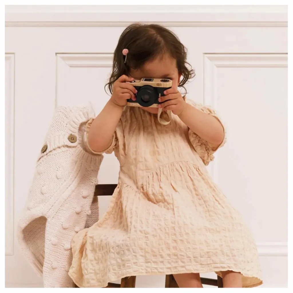 - Ce charmant appareil photo rétro en bois FSC™ invite les enfants à explorer leur imagination. Il est équipé d’un objectif kaléidoscope rotatif et de modes réalistes à l’arrière pour varier les prises de vue.