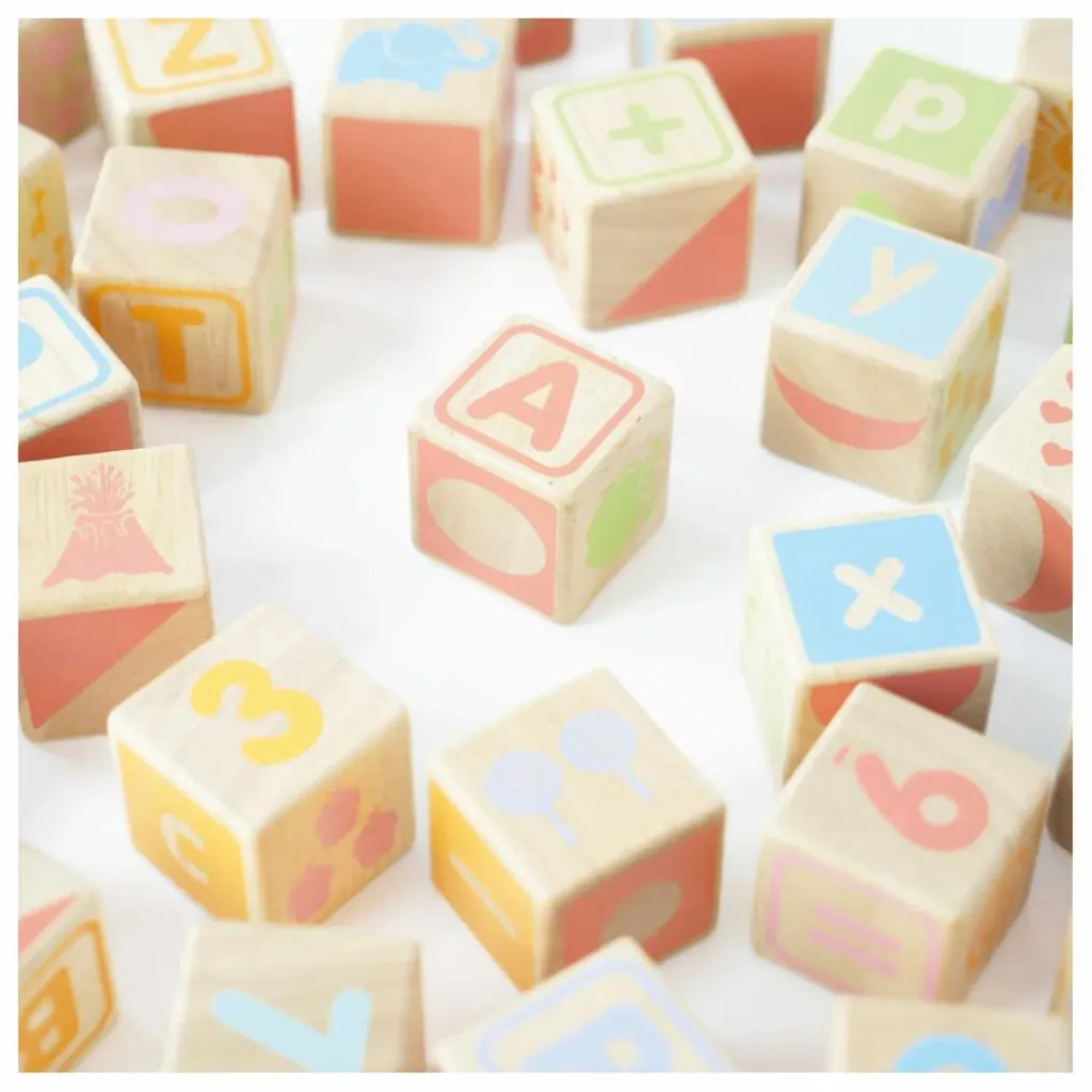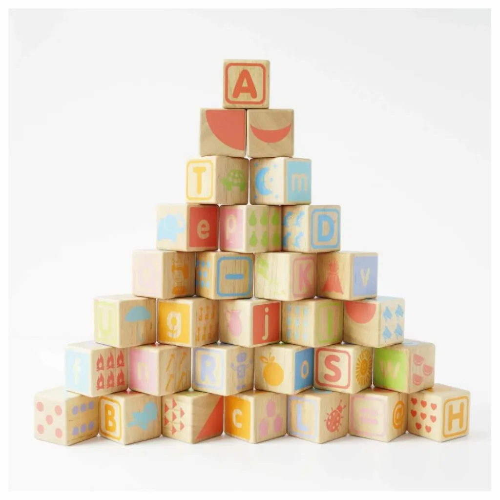- Apprenez l’alphabet aux enfants avec ce jeu de cubes , fabriqué à partir de bois certifié FSC™. Composé de 30 pièces épaisses, en bois aux couleurs vives et aux bords lisses, cet ensemble est conçu pour résister à de nombreuses années de jeu et est livré avec un plateau de rangement en bois très pratique.