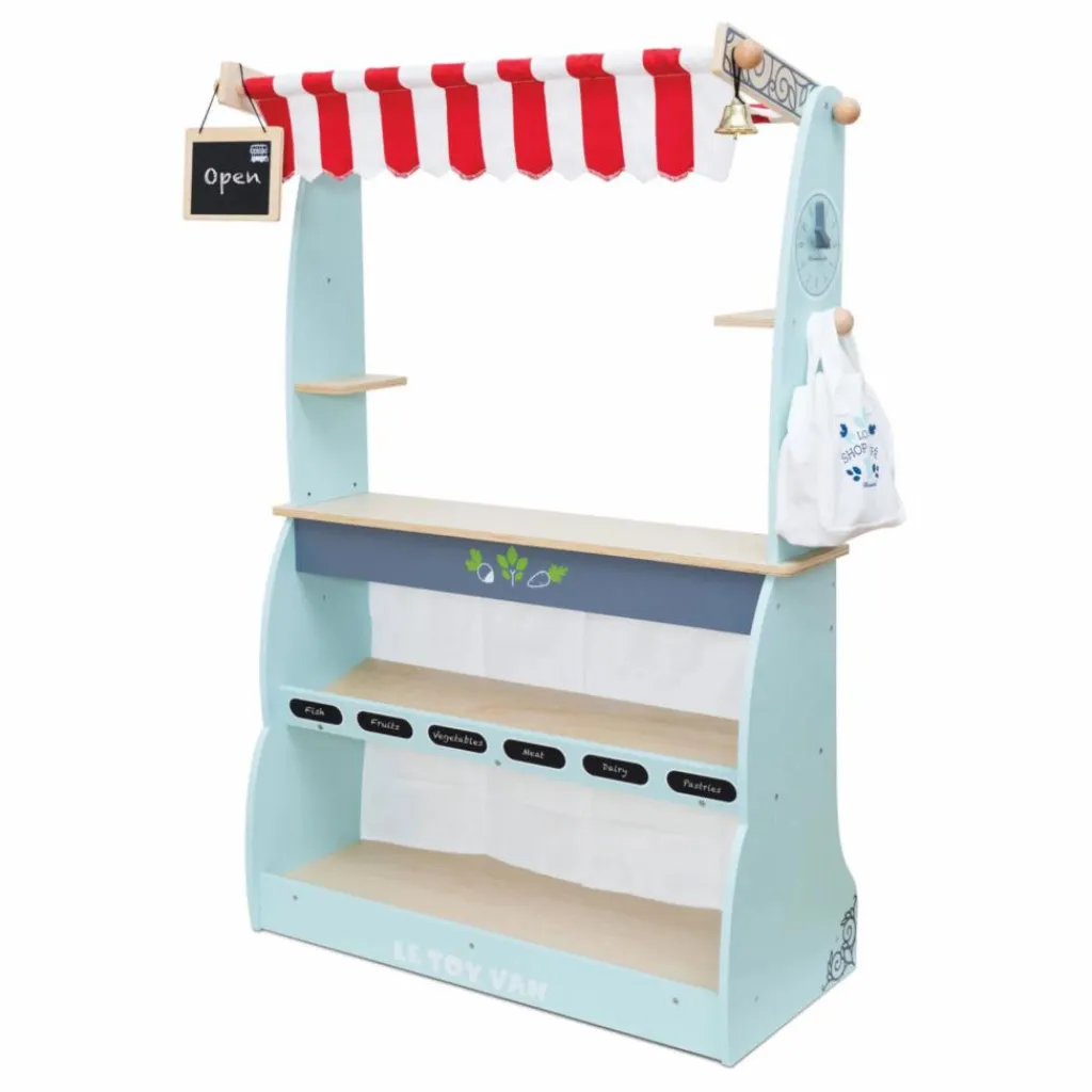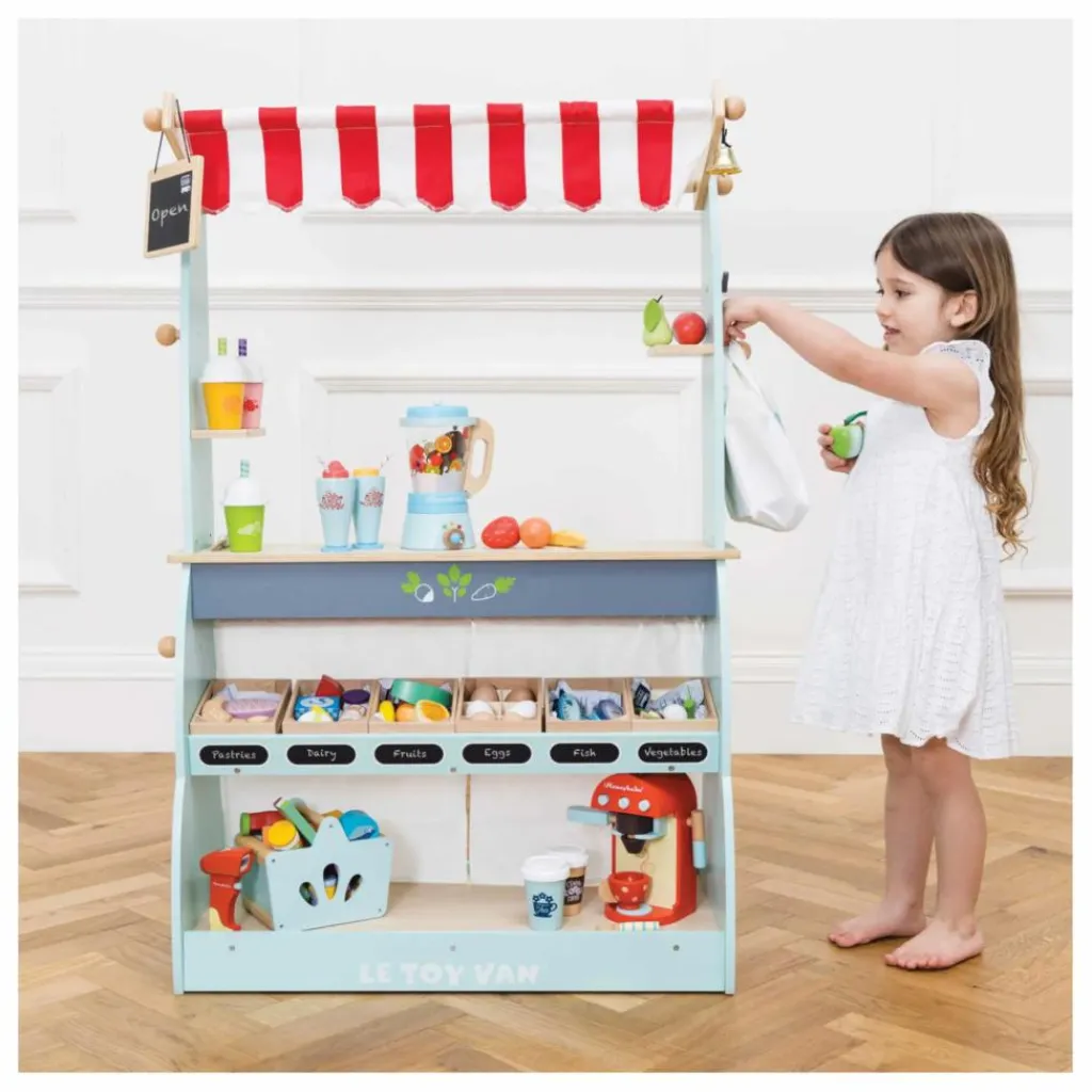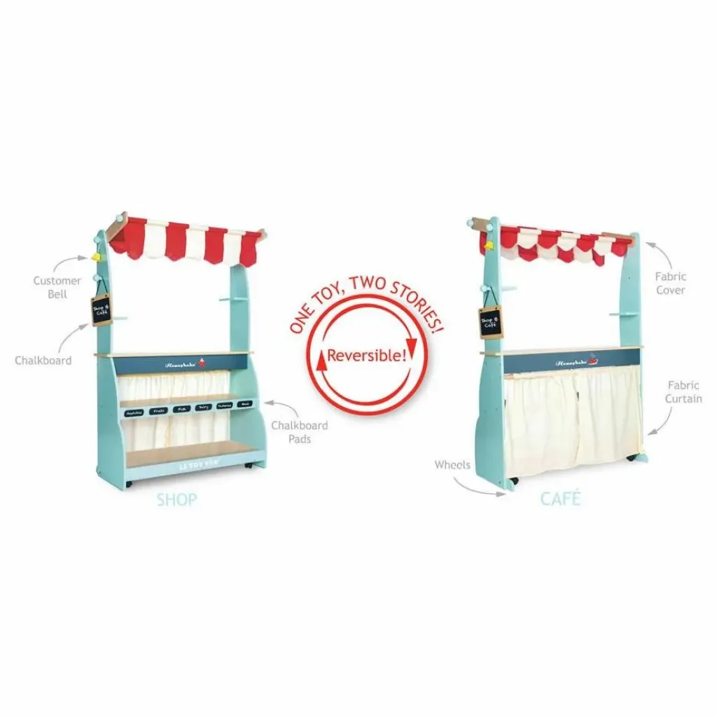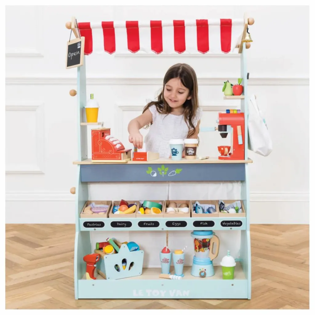 Cette boutique peut aussi se transformer en café en fonction des envies de jeu du jour. Elle promet des heures de jeu. Les petits vont adorer servir les clients au café, puis il suffit de le retourner pour révéler un magasin de style marché avec des étagères, idéal pour abriter nos caisses de nourriture en bois.