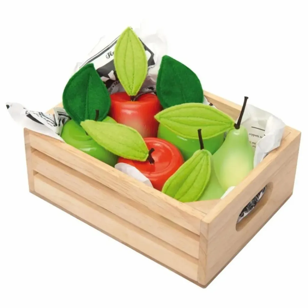 - 1 marchande honeybake, 1 sac de courses en tissu, 1 cloche que les clients peuvent sonner pour attirer l’attention, 1 cagette de fruits avec papier journal, 4 pommes, 2 poires