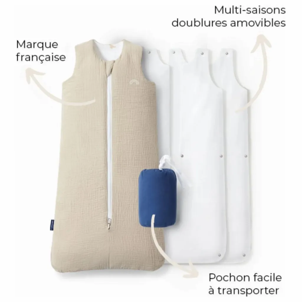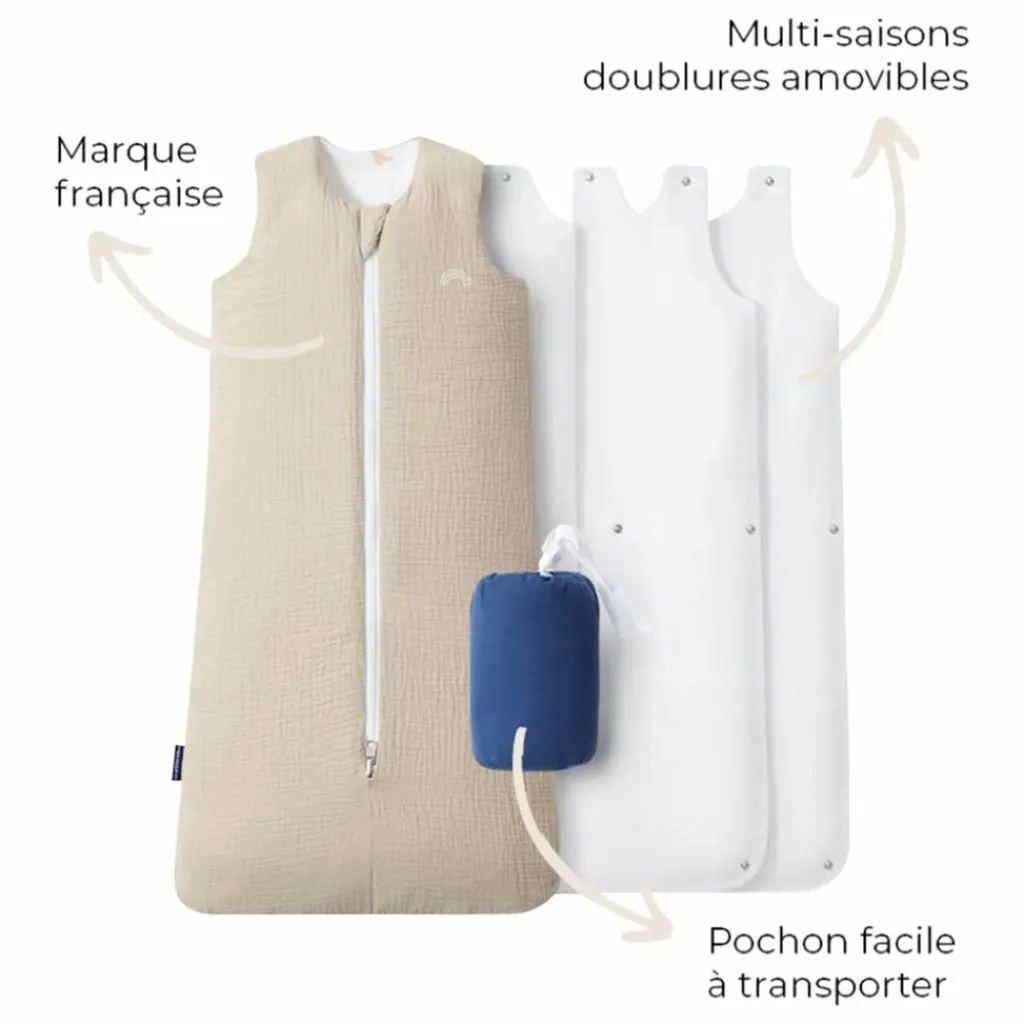 Astucieuse, cette gigoteuse s’adapte toute l’année et dans toutes les situations grâce à son épaisseur évolutive. De plus, elle est facilement transportable grâce à son petit pochon.