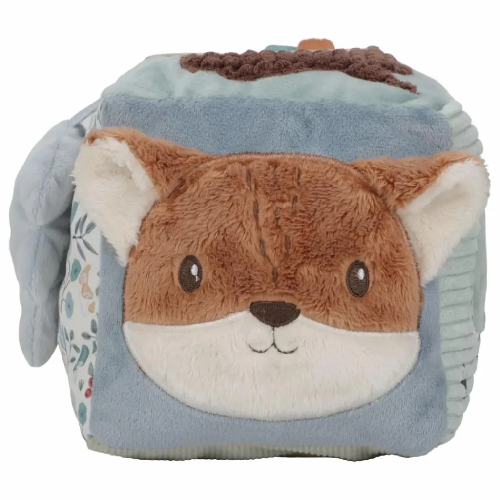 - Une collection colorée de textures, de sons et de personnages inspirés de la forêt se réunissent dans le design de ce cube d’activités doux.