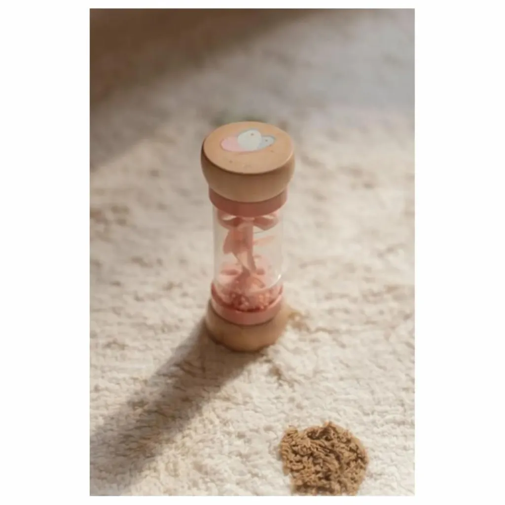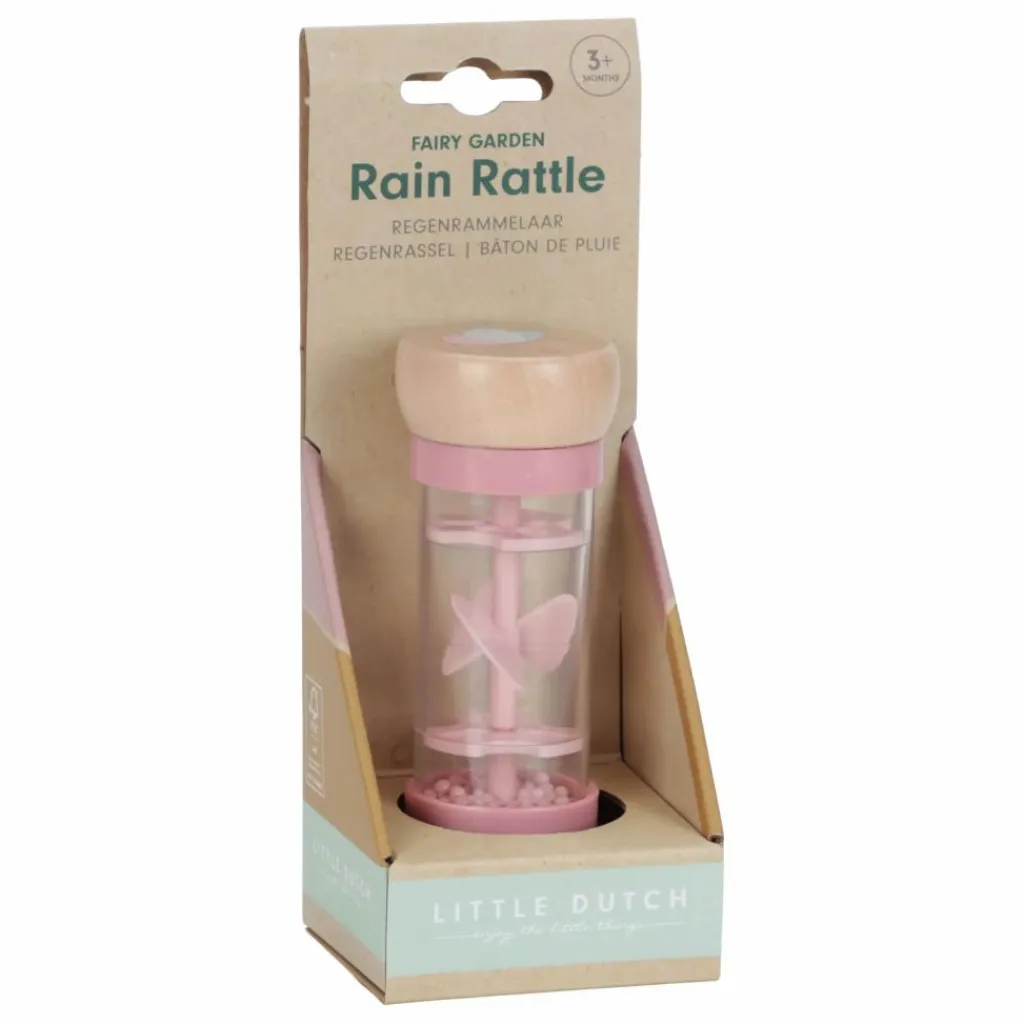 - Retourne le hochet et écoute les sons reposants de gouttes émis par les billes qui se déplacent d’un côté à l’autre du bâton de pluie. Il stimule le développement sensoriel et le talent musical de bébé. Les billes, de 3 couleurs différentes, tombent dans de petites ouvertures dans le tube et font tourner l’hélice, ce qui émet un son agréable. Le hochet bâton de pluie est conçu pour les petites mains. Le dessus et le dessous en bois sont décorés d’une illustration d’une fleur et d’un papillon de la collection Fairy Garden.