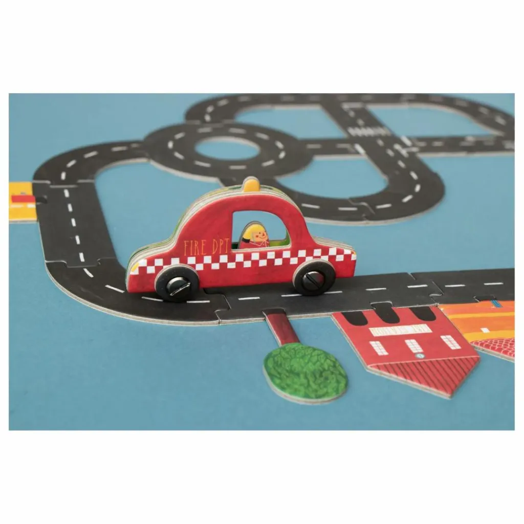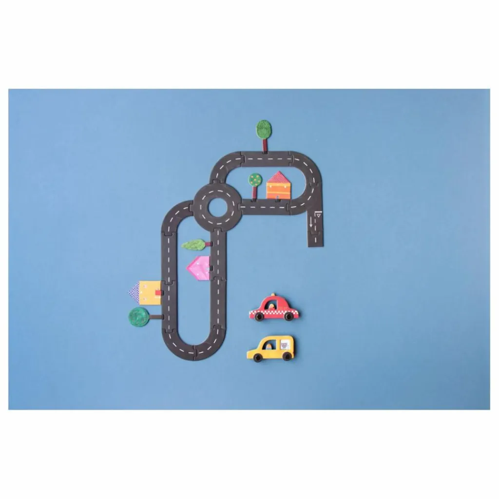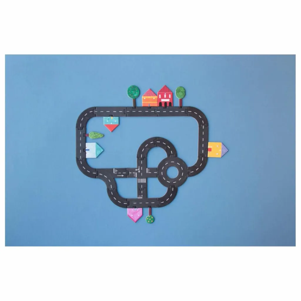 - Jeu de 48 pièces à assembler pour créer un circuit (11 circuits possibles) : 34x routes – x6 maisons – x8 arbres – 2x voitures – pochette tissu