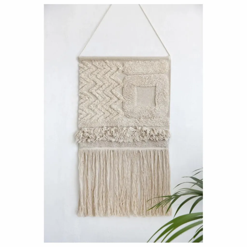- Décoration murale, faite 100 % à la main, elle semble être un fragment de tapis avec des tufting à motifs multiples en coton naturel non teint. Ce design polyvalent dans une nuance neutre de beige ajoutera un accent bohème à n’importe quel coin.