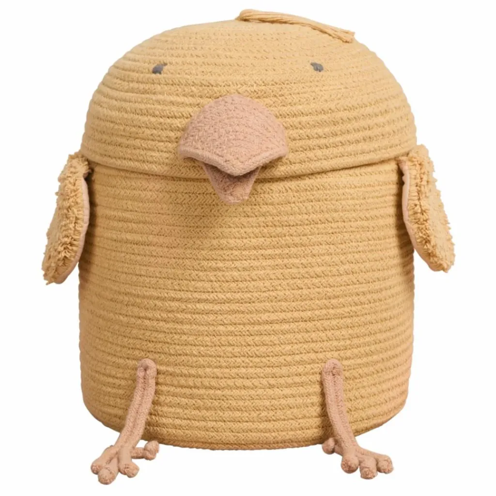 - Fabriqué à la main à partir d’un cordon tressé composé de fibres provenant de bouteilles PET recyclées mélangées à nos fils de coton de couleur dorée douce, le panier Charlie le poulet a un bec et des pattes tressées de couleur rose, ainsi que des ailes jaunes touffetées.