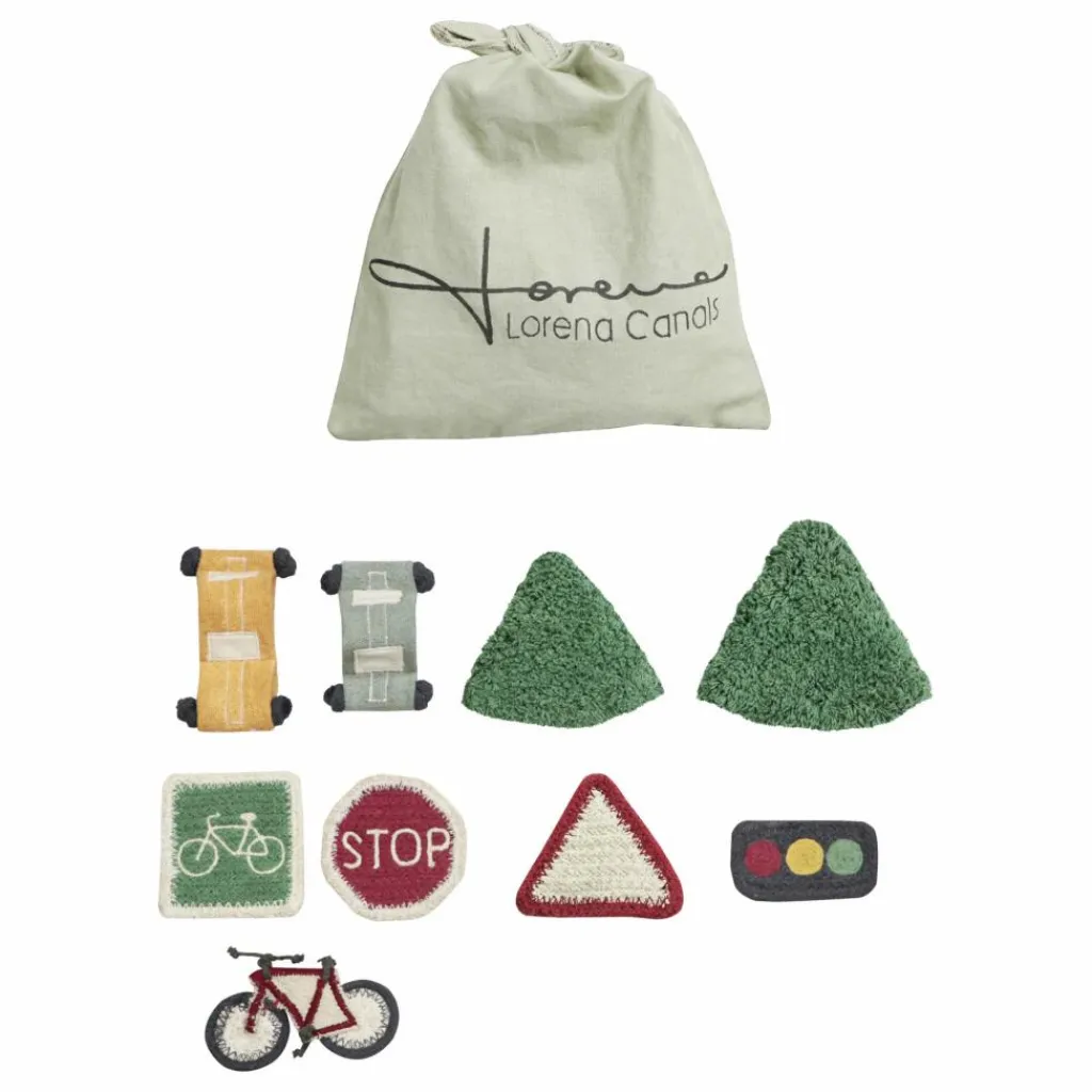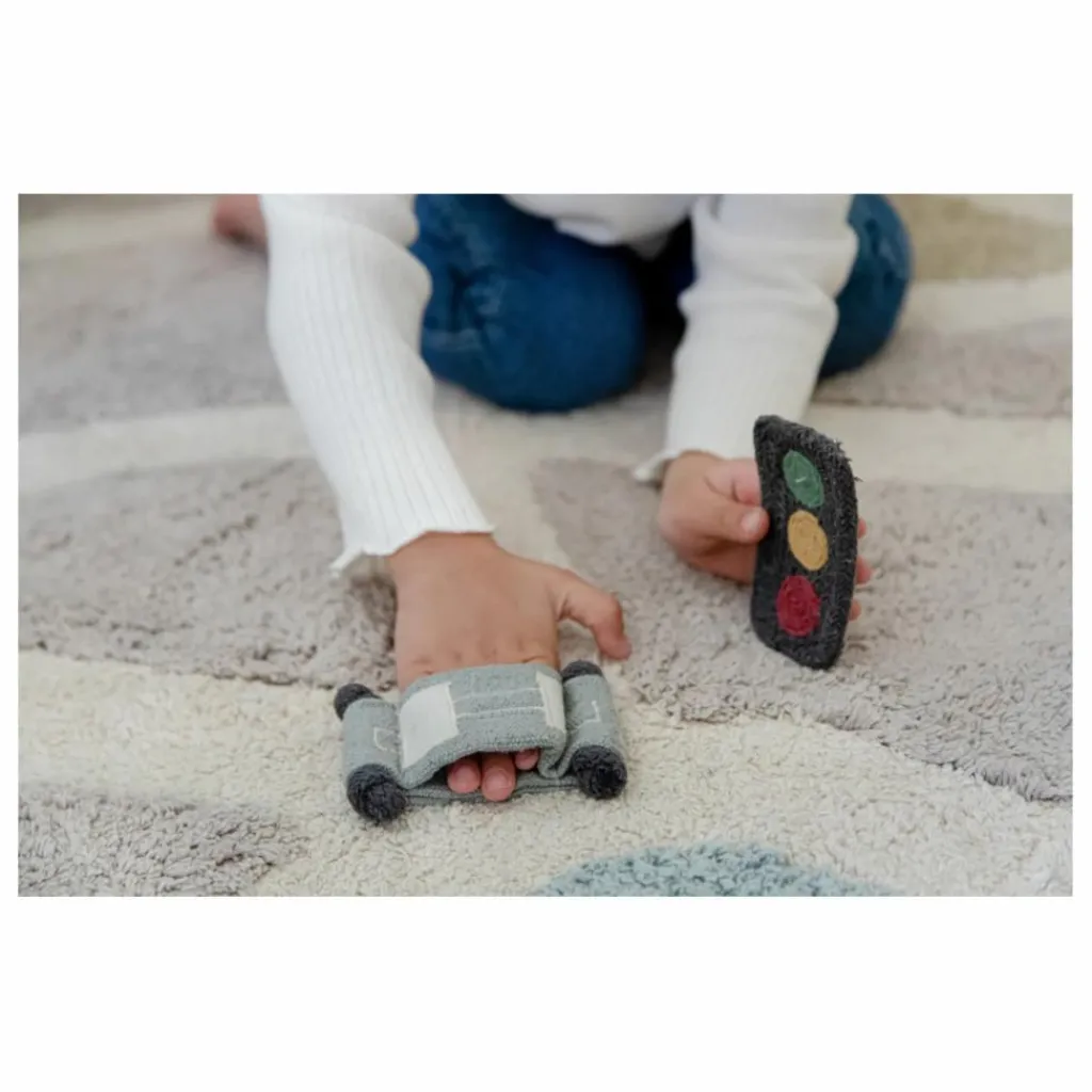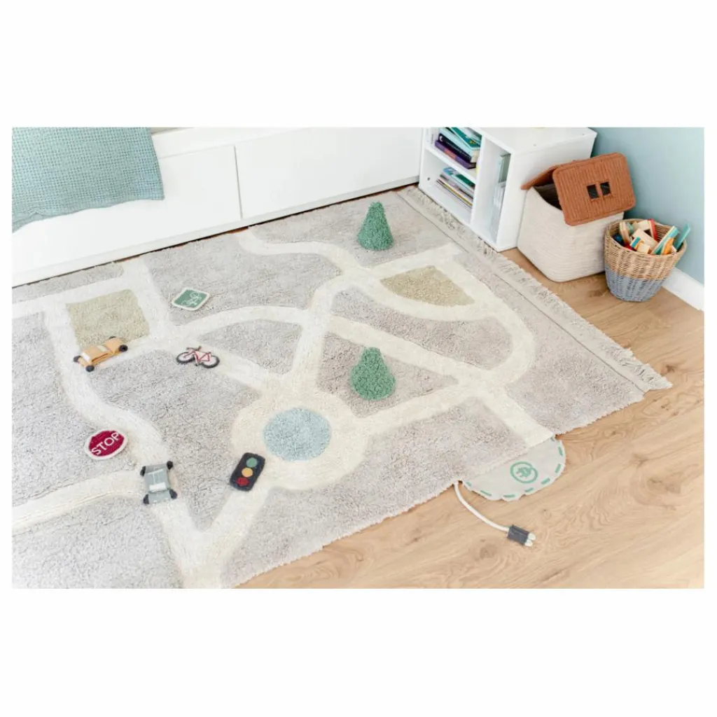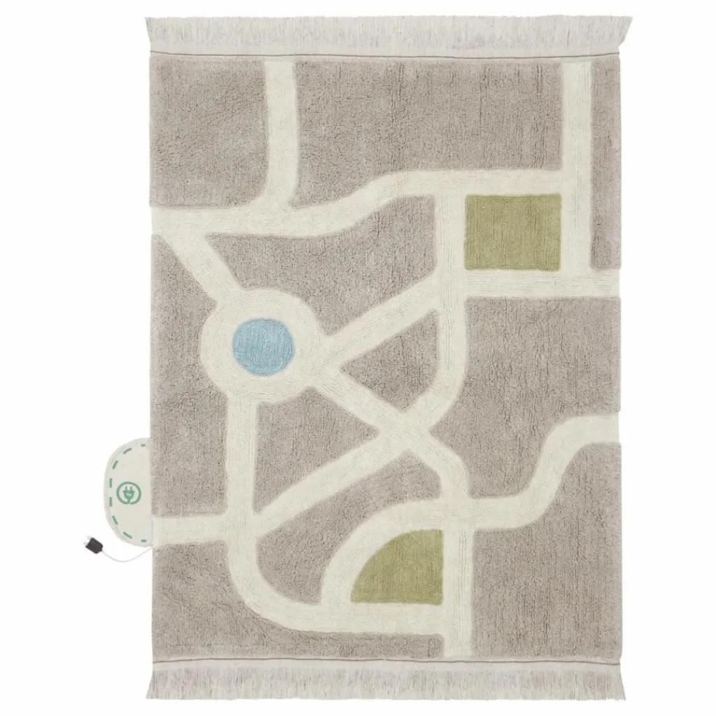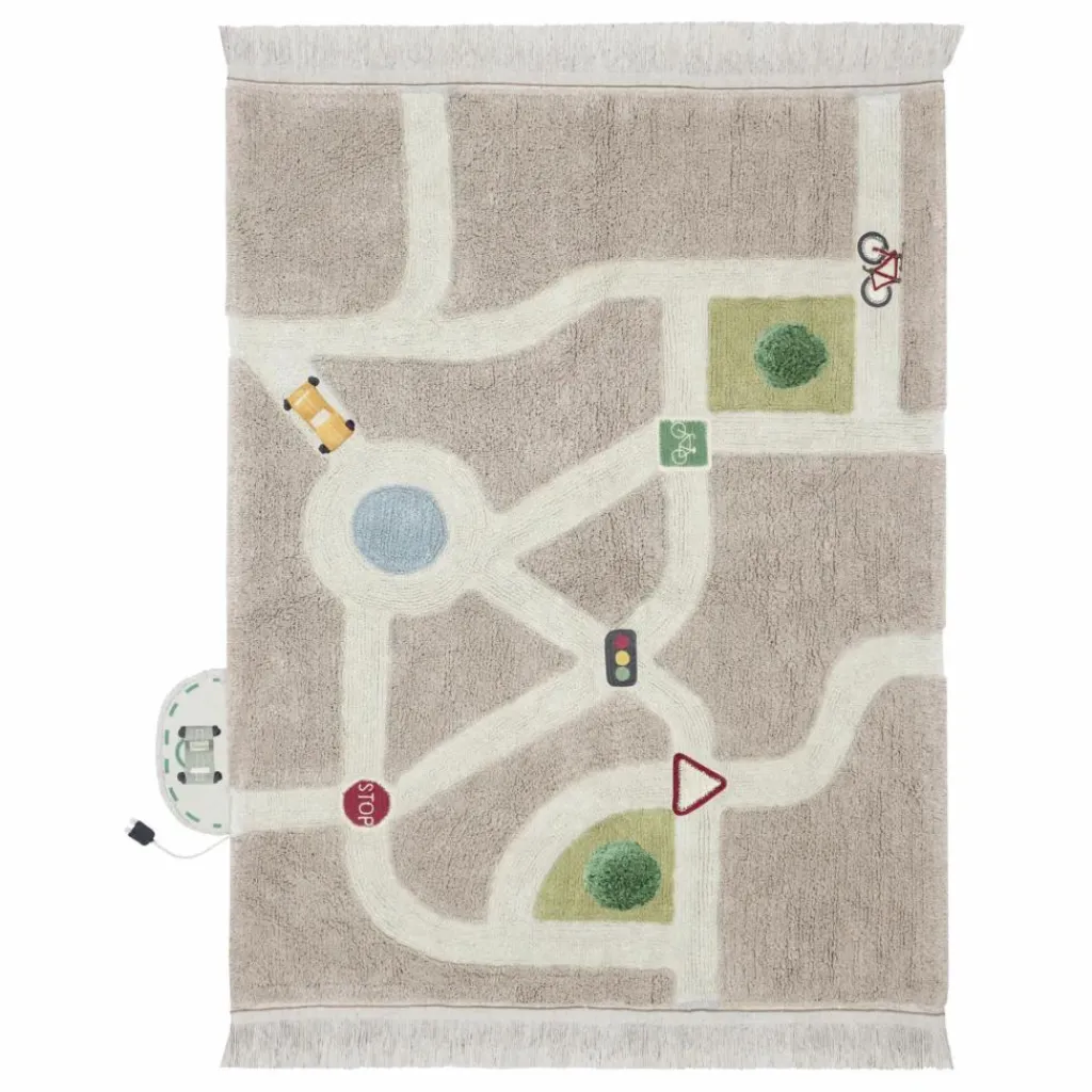 - Fabriqué en coton doux, ce tapis est livré avec un sac rempli d’accessoires amusants pour concevoir votre propre ville. Avec le beige pierre comme couleur principale, le tapis présente un motif de rues de couleur naturelle, avec une fontaine en bleu aqua et des parcs de couleur olive douce. Le tapis est doté de franges courtes et est livré avec des voitures en coton fabriquées de manière artisanale, des arbres, des panneaux de signalisation et une borne de recharge pour les voitures électriques.