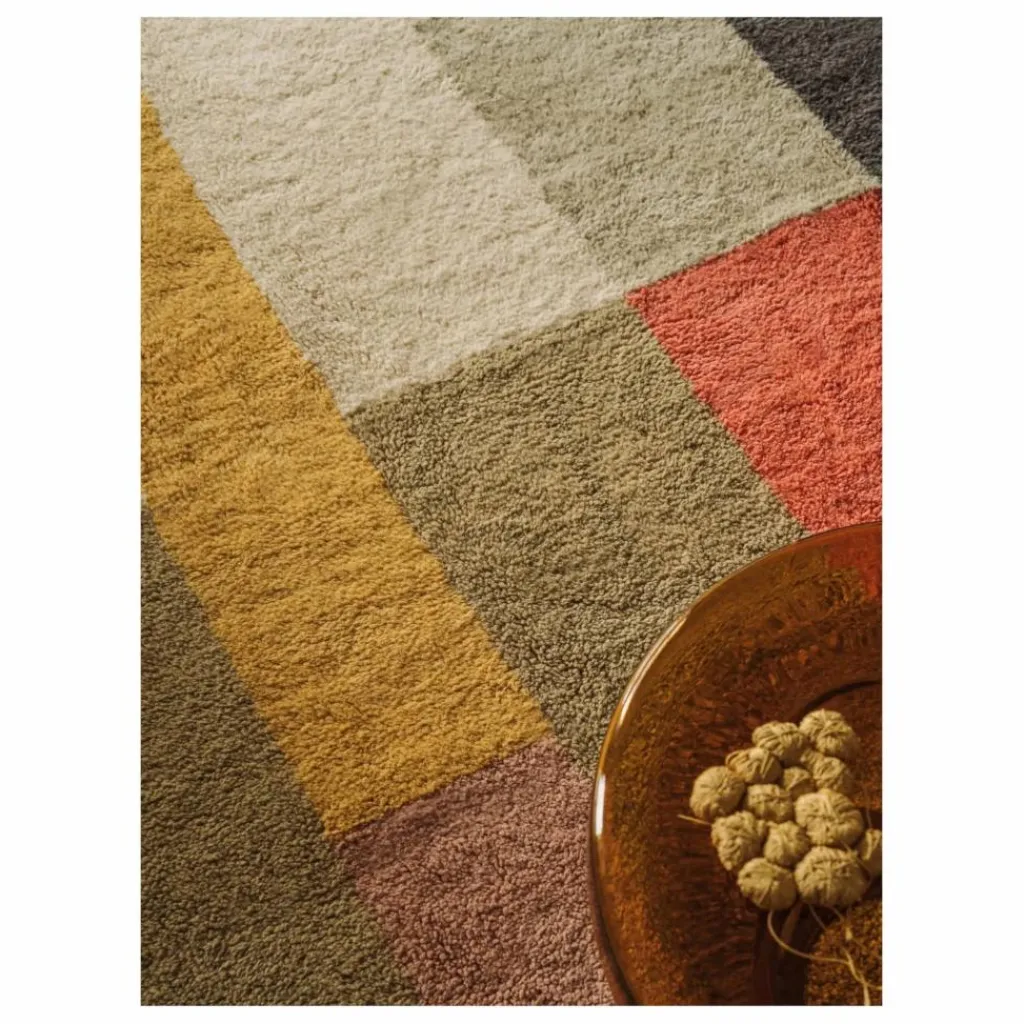 - Créez un espace de rêve avec ce tapis en laine coloré présentant un design géométrique audacieux. Six blocs en Basilic, Corail Épicé, Gel d’Amande, Coquillage, Mousse et Charbon séparés par des rayures en Charbon, Coquillage, Caramel et Rose Poussiéreux.