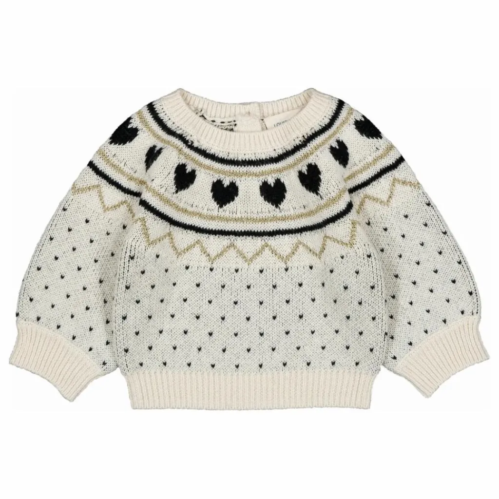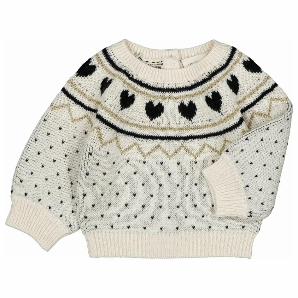 Détails : Manches longues, col rond, jacquard coeur. Lavage en machine conformément aux instructions sur l’étiquette.