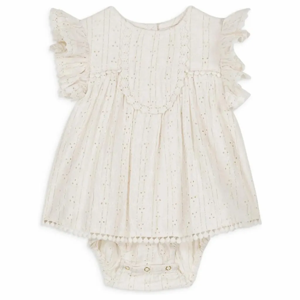 Barboteuse effet robe en voile de coton broderie anglaise avec rayures lurex.