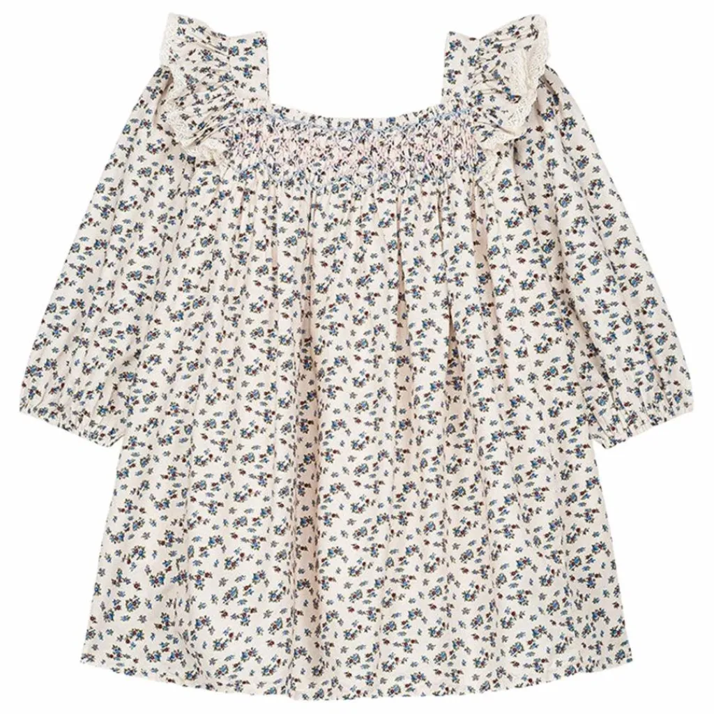 Détails smockés et brodés à la main à l’encolure.
