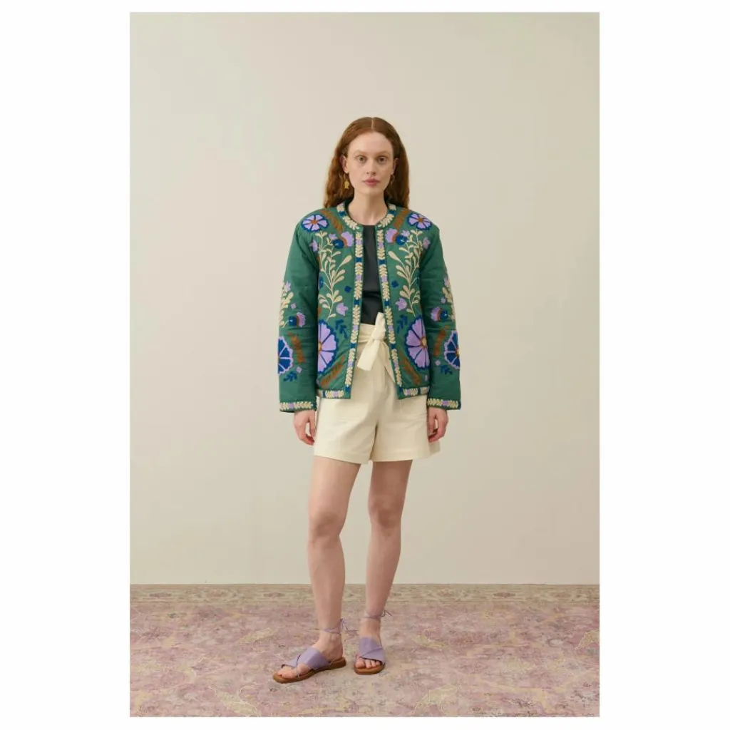 Frise brodée le long de l’ouverture devant, encolure, en bas de manches et en bas de vêtement.