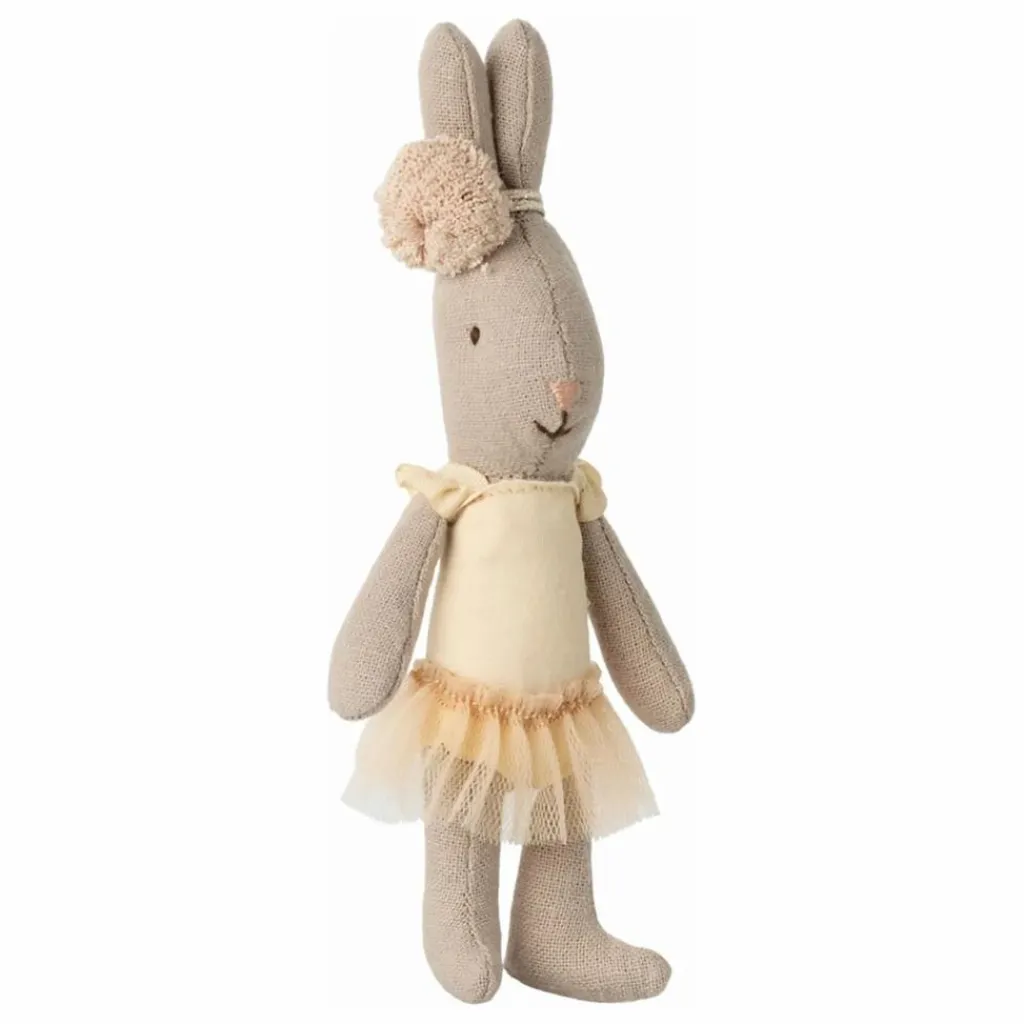 - La célèbre lapine Micro Maileg est habillée en danseuse de ballet. Elle porte un body, une jupe en tulle et un joli bandeau à pompon, autour de ses oreilles relevées.