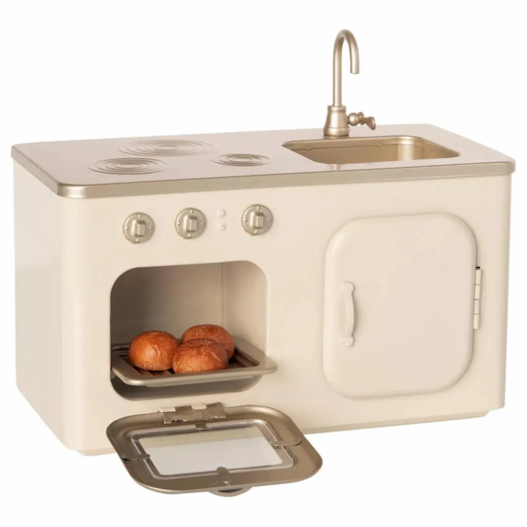 Complétez votre cuisine Maileg à l’aide de cette cuisinière toute équipée : évier, plaques de cuisson, four et rangement.