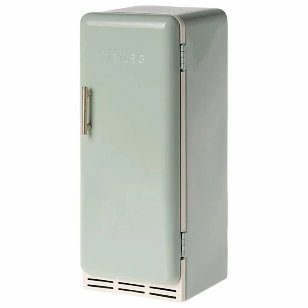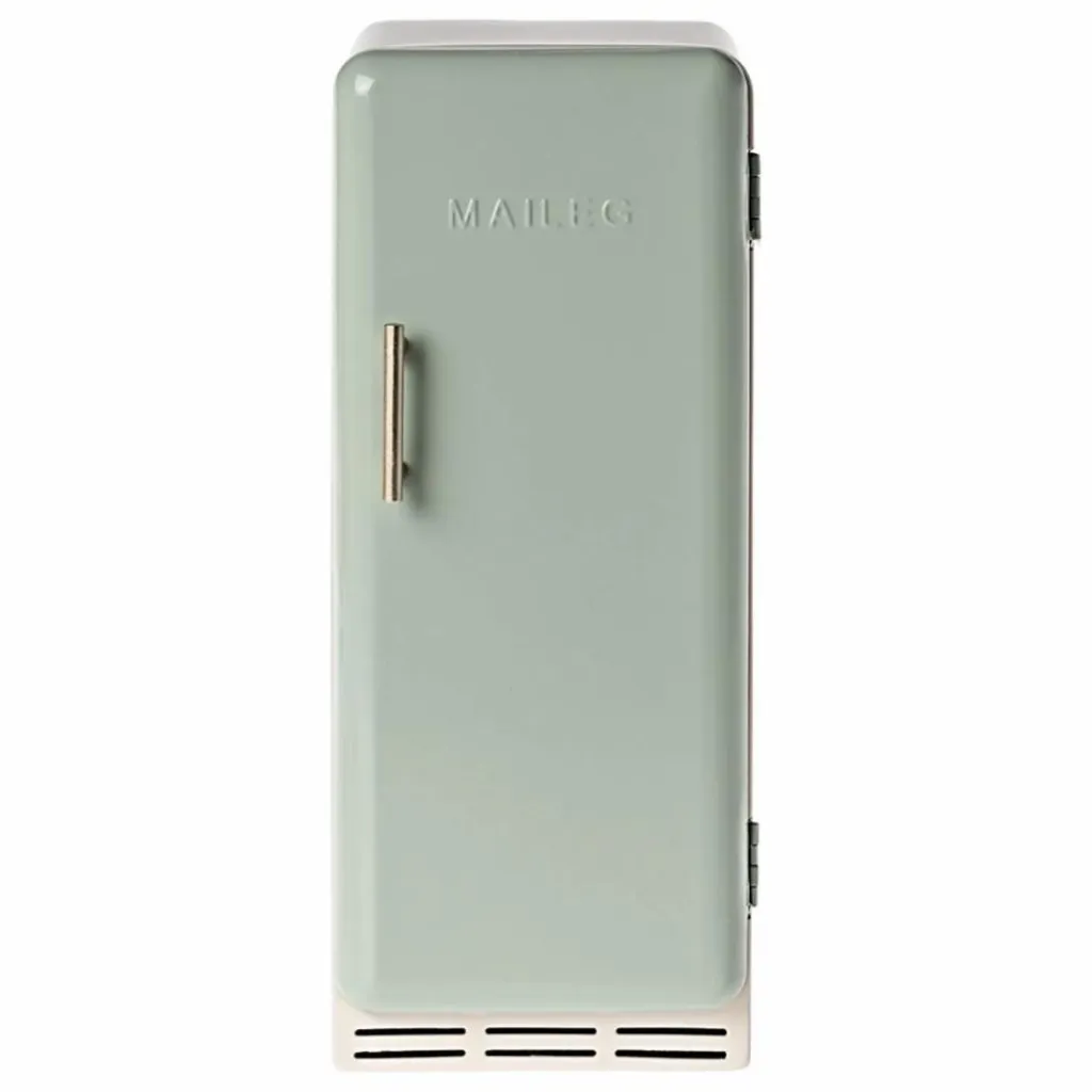 Un réfrigérateur vintage qui s’intègre parfaitement à la maison de poupée miniature « dollhouse ». Il est en métal avec une fermeture magnétique et des étagères givrées à l’intérieur.