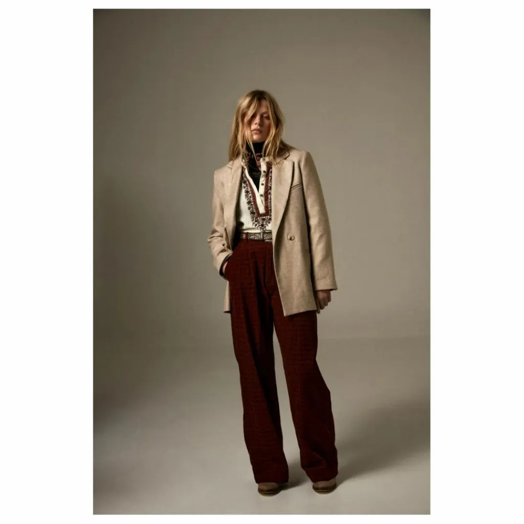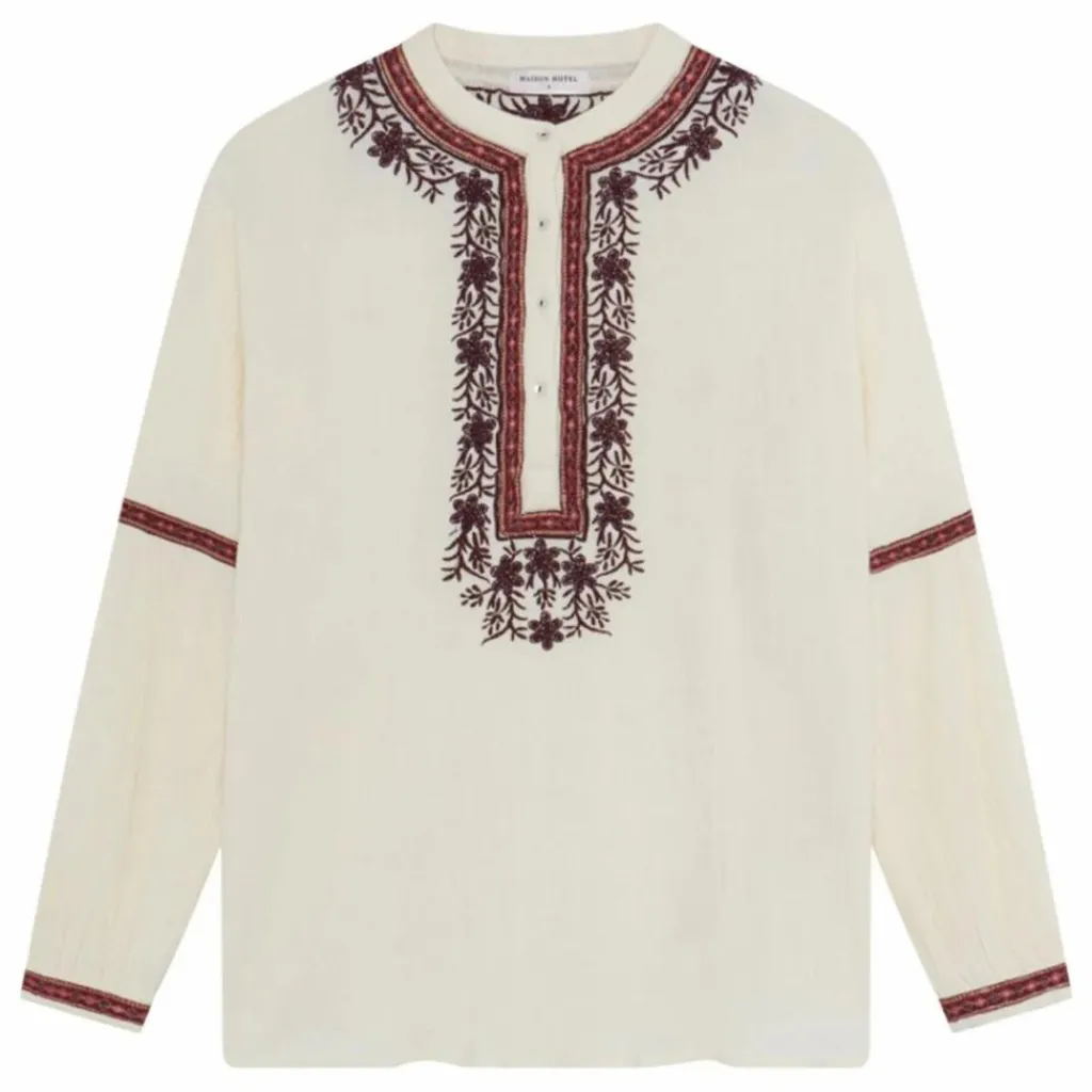 Une broderie bordeaux intense orne l’encolure, les poignets et les manches. Les points évoquent l’artisanat traditionnel, avec un rythme clair et précis.