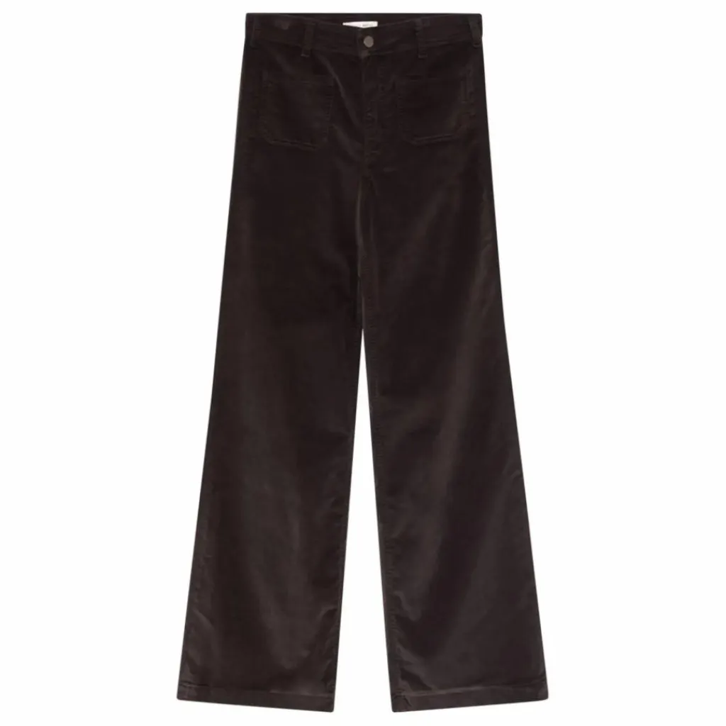 - Pantalon en velours côtelé marron chocolat, à taille haute et jambes évasées. Sa texture épaisse et douce offre confort et élégance, idéal pour affronter la saison froide avec caractère.