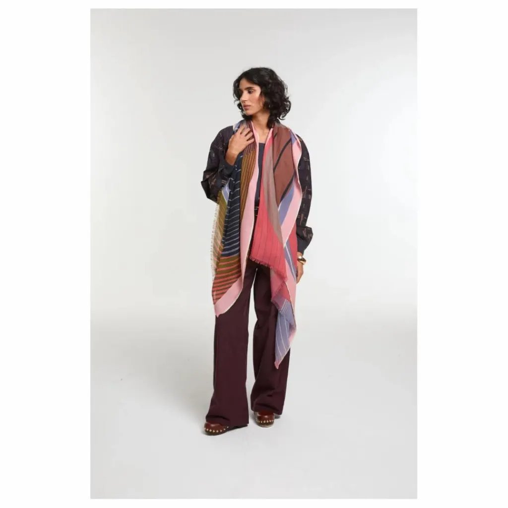 - Le foulard Astre invite à un voyage céleste. Son motif géant évoque des planètes qui se confondent et s’entrelacent dans un réseau de courbes fluides, dessinant une cartographie imaginaire du ciel. Entre jeu de jour et de nuit, de clair-obscur, ce foulard explore les contrastes avec subtilité
