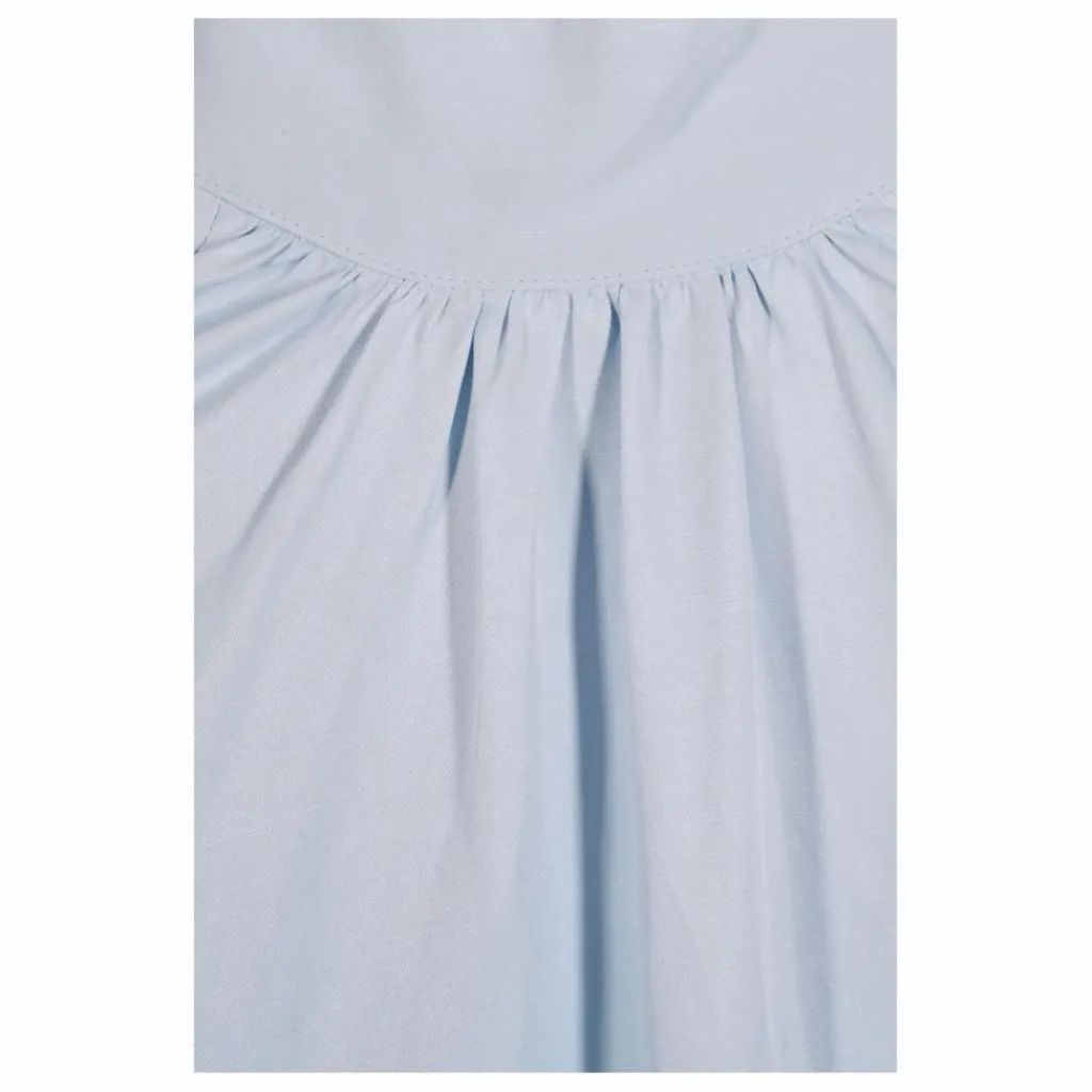 - Haute encolure froncée – Larges poignets volantés ornés de rubans – Coupe décontractée, légèrement en A – Fermeture par boutons à l’arrière de l’encolure – Confectionnée dans un tissu soyeux bleu clair.
