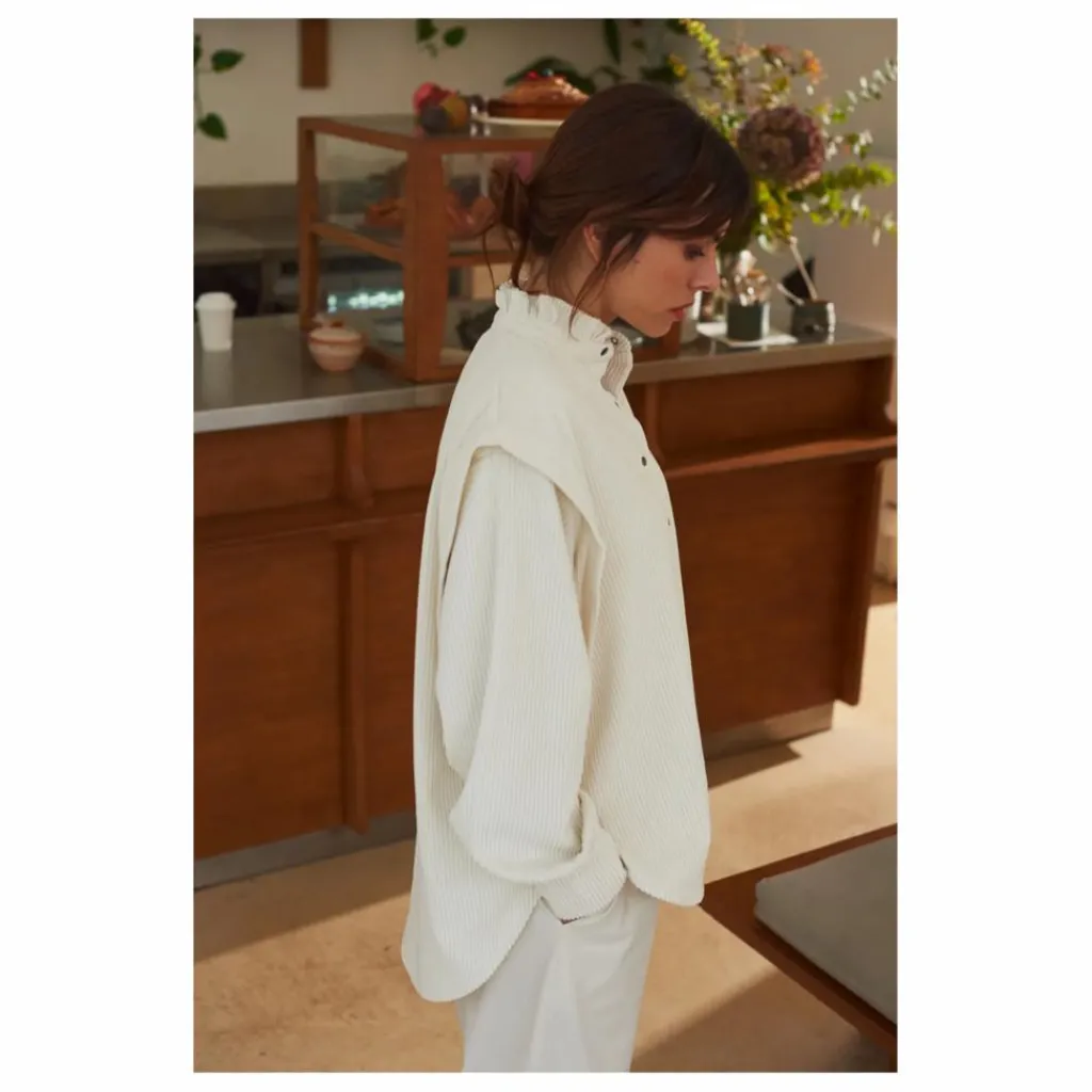 - La chemise Carmen séduit par son col délicatement froncé et son velours côtelé en coton 100 % naturel. Sa coupe ample et sa teinte écrue en font une pièce chic et confortable, parfaite pour un style minimaliste affirmé.